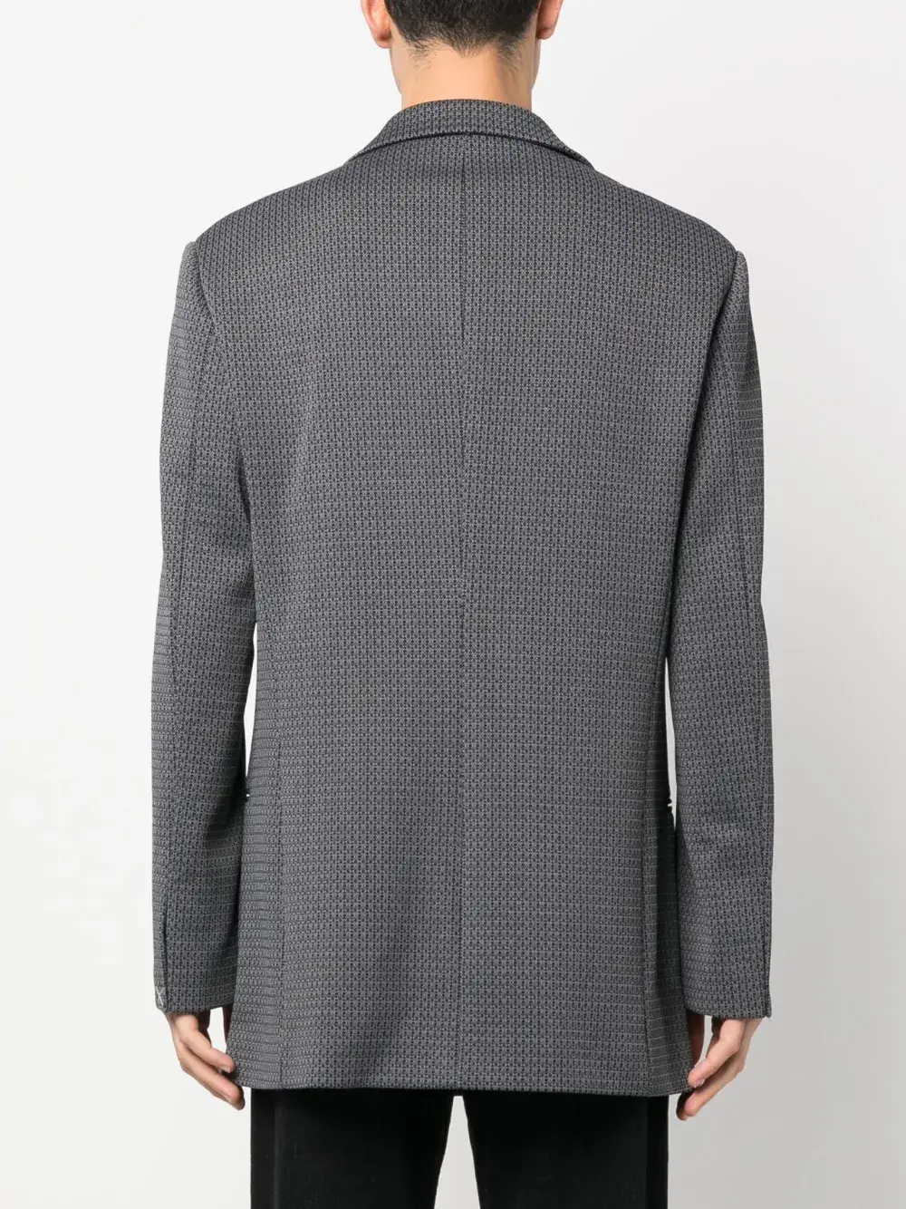 Серый, узор в ломаную клетку, широкие заостренные лацканы, двубортная застежка на кнопки, прорезной карман на груди, два прорезных кармана спереди, длинные рукава и прямой подол.