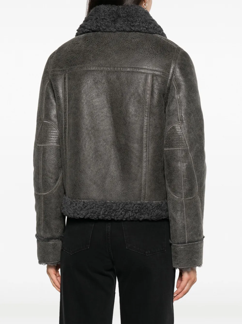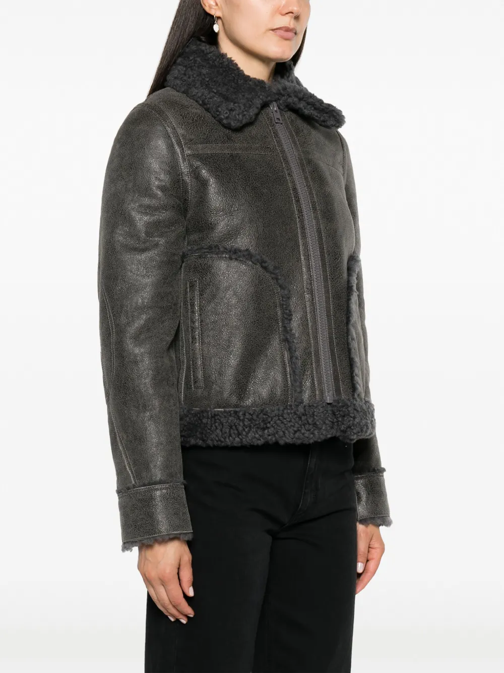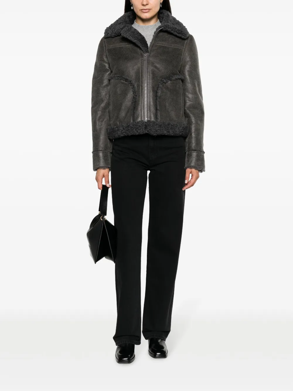 Антрацитово-серый, овечья кожа, подкладка из овечьей шерсти, отделка из овчины, воротник из овечьей шерсти, застежка на молнии спереди, длинные рукава, два прорезных кармана по бокам и прямой подол.