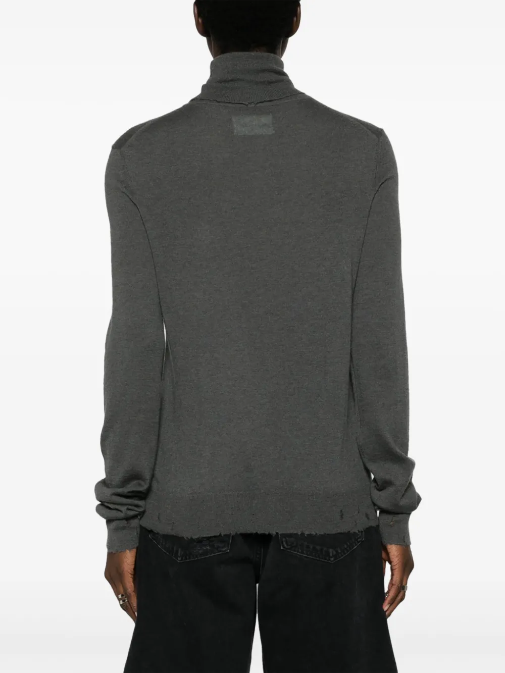 Угольно-серый, кашемир, трикотажный материал, искусственно состаренное покрытие, высокий воротник, длинные рукава и прямой подол.
