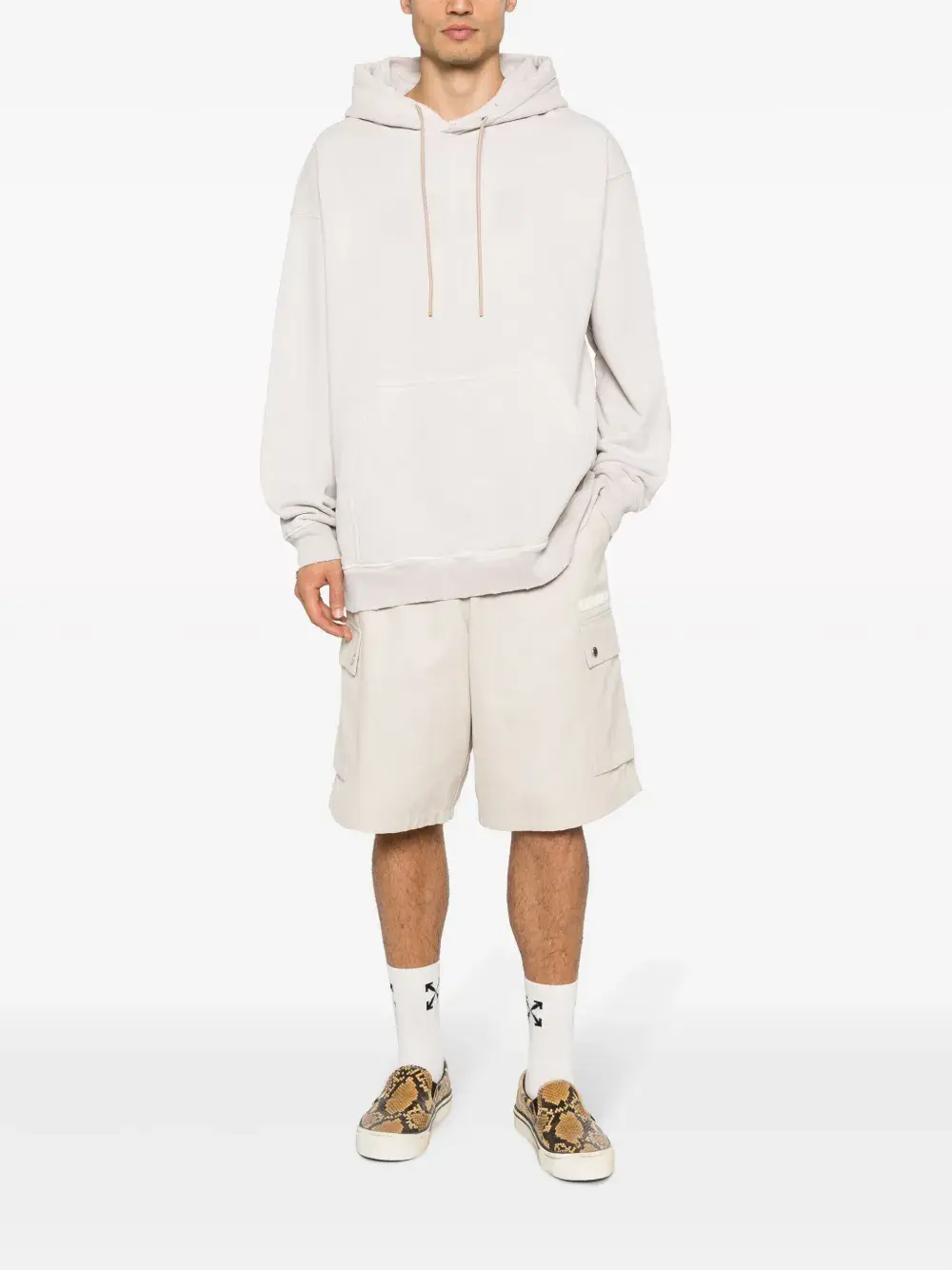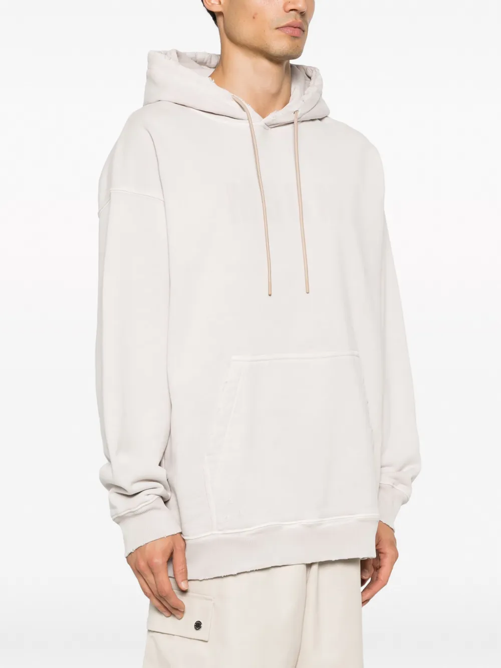 Эффект потертости, затягивающийся на шнурок капюшон и карман-муфта.