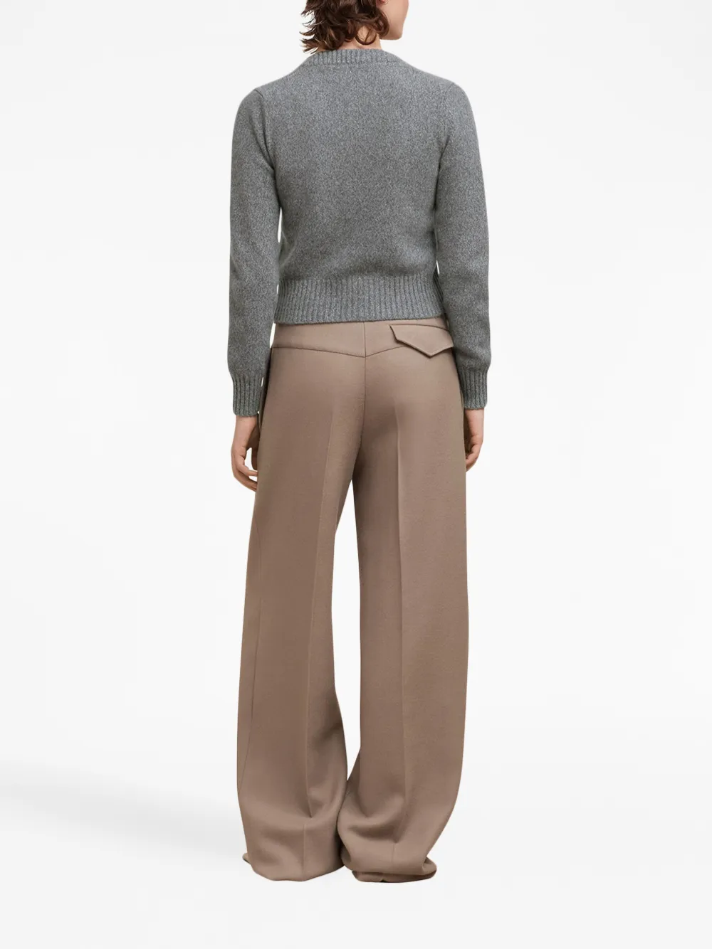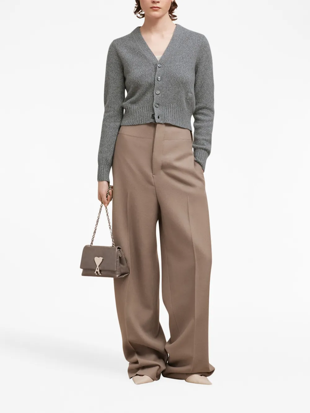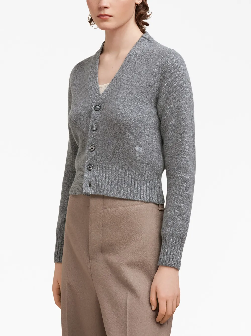 Серый, смесь шерсти и кашемира, знаковая монограмма Ami de Coeur, V-образный вырез, застежка на пуговицах спереди, длинные рукава и подол в рубчик.