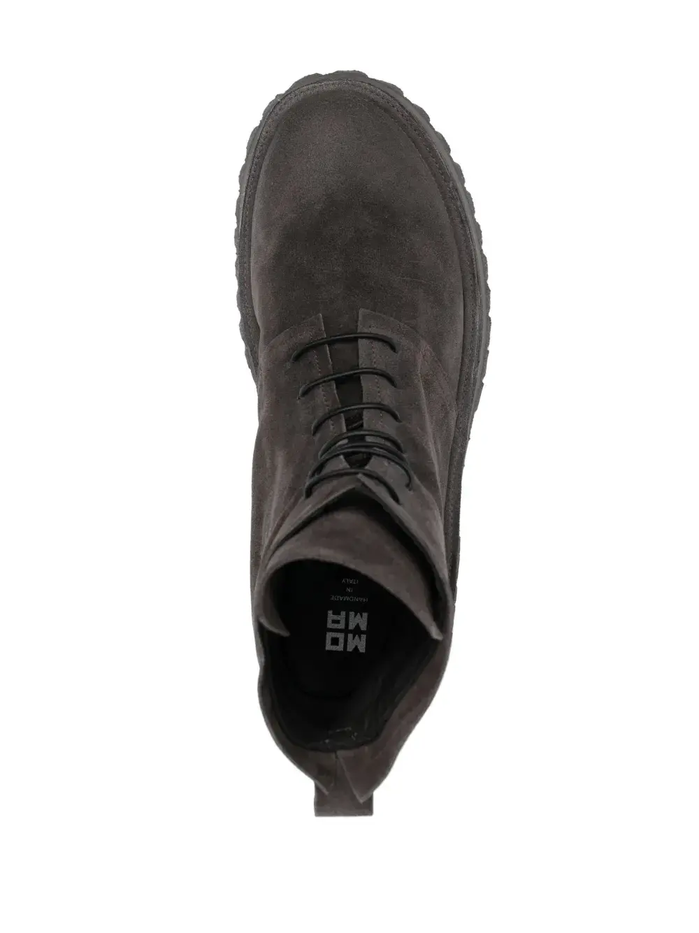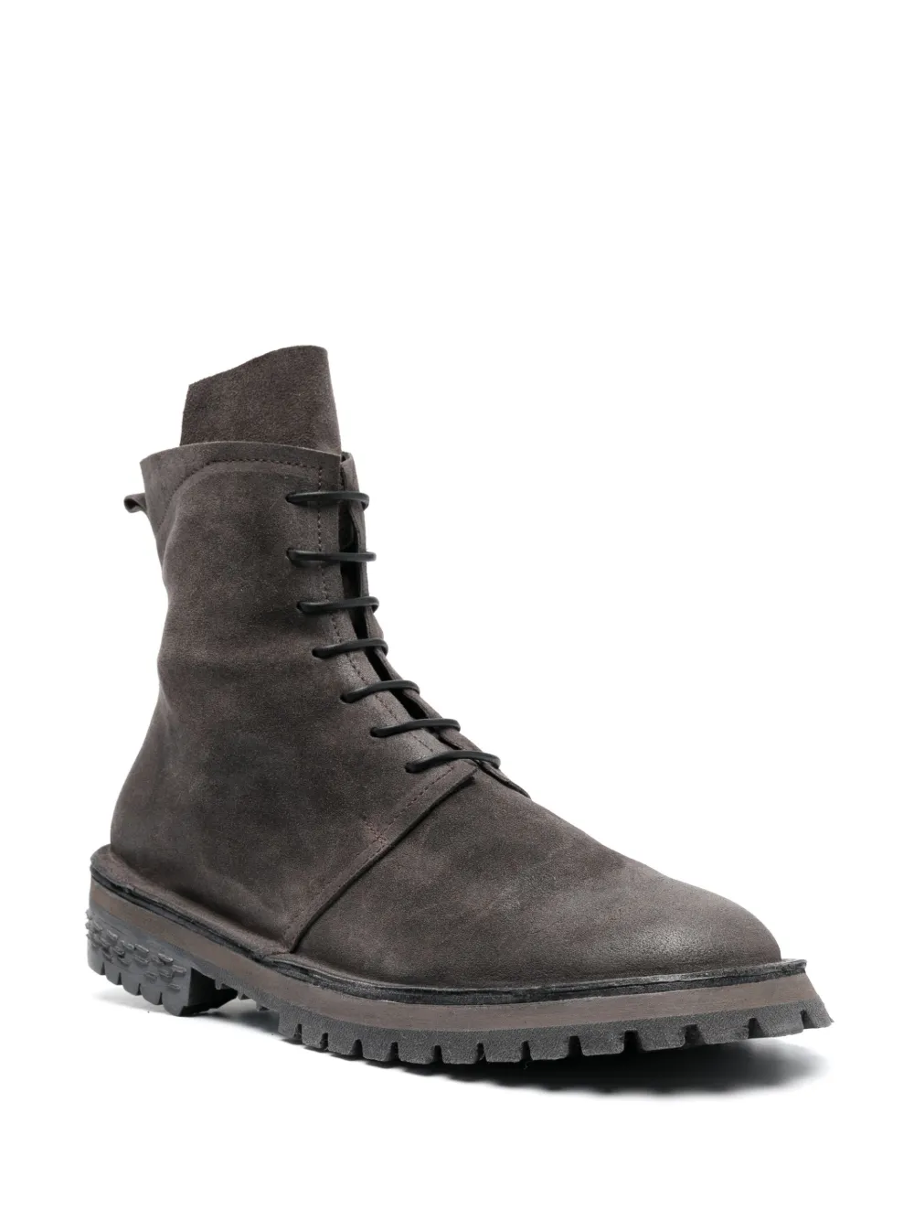Серый, замша из телячьей кожи, закругленный носок, шнуровка спереди, петля для подтягивания сзади и рифленая резиновая подошва.