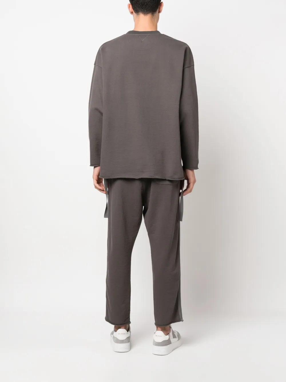 Угольно-серый, хлопок, логотип спереди, драпировка, круглый вырез, приспущенные плечи, длинные рукава и прямой подол.