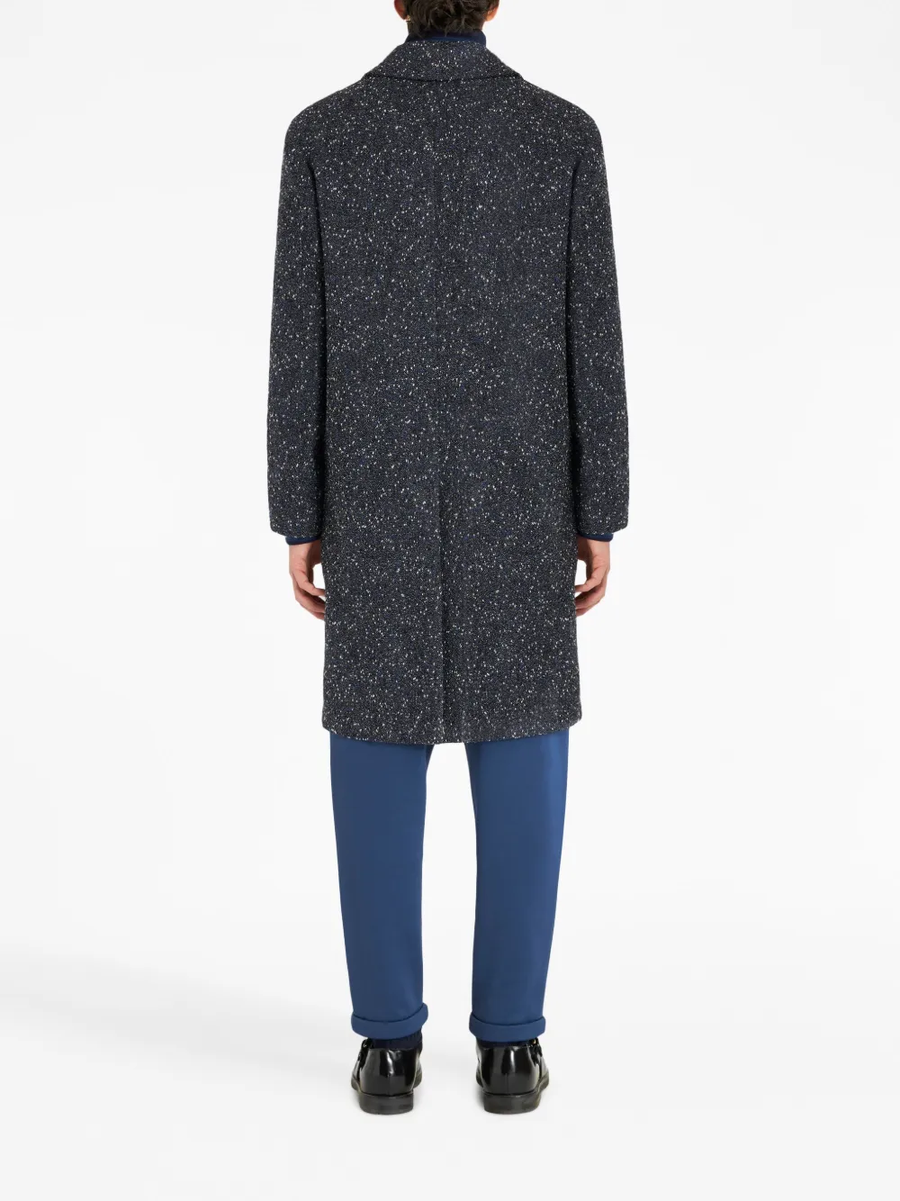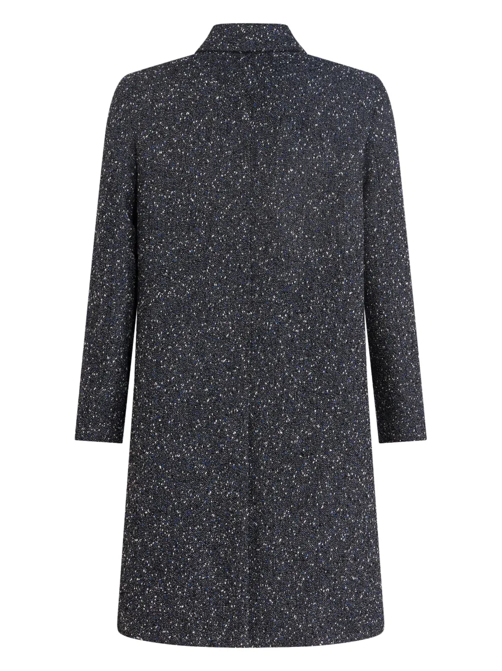 Темно-серый, смесовая необработанная шерсть, контрастная отделка, вырез сзади, отложной воротник, застежка на пуговицах спереди, два передних кармана с клапанами, длинные рукава, прямой подол и длина по колено.