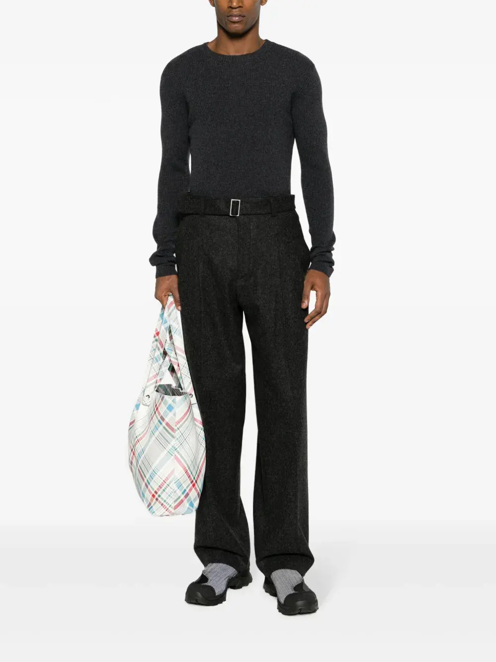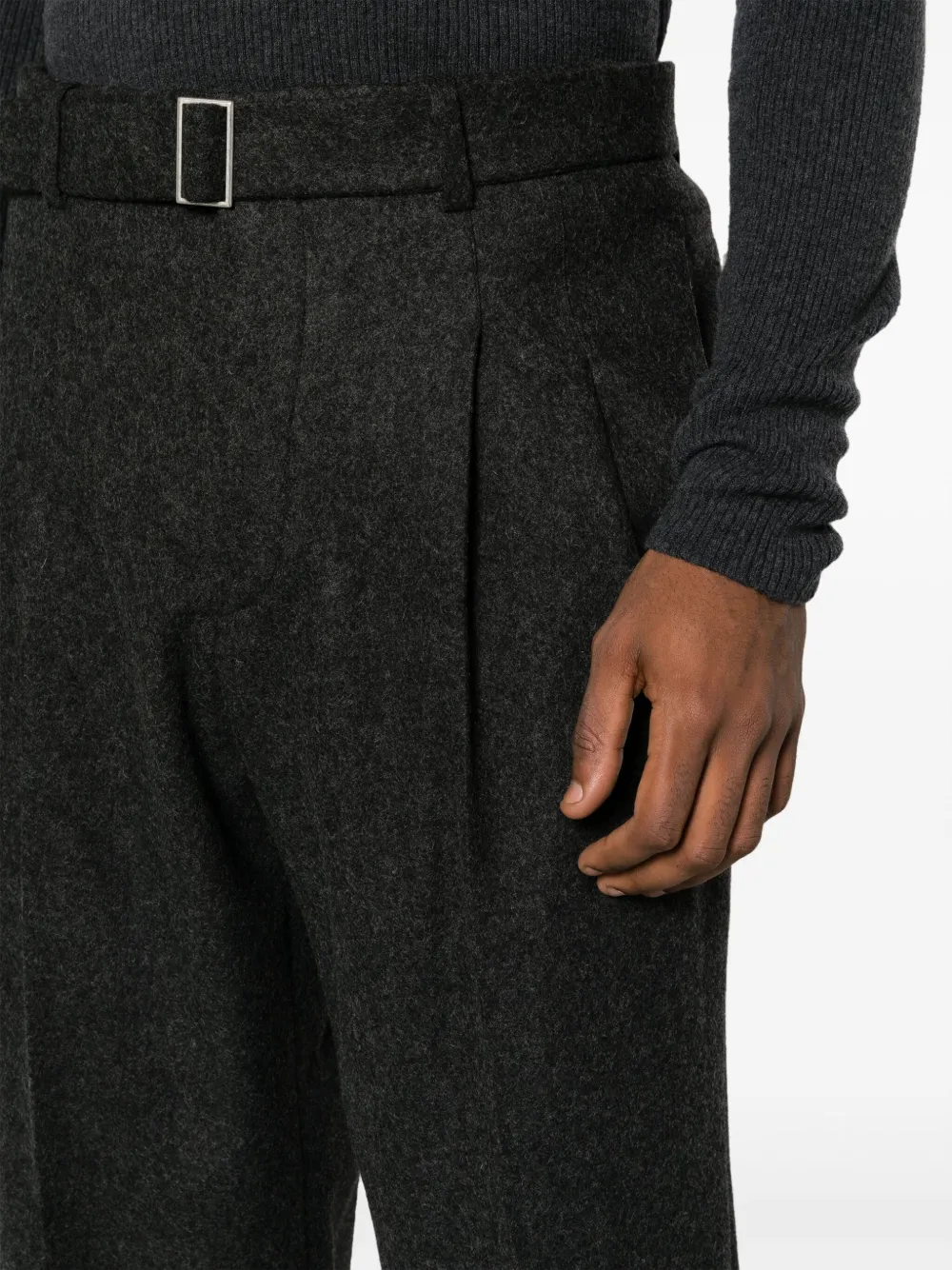 Темно-серый, смесовая шерсть, эластичный пояс, застежка на молнии спереди, два прорезных кармана по бокам, задние карманы с листочкой, прямой крой и манжеты с завязками. Это унисекс-модель. Обратите внимание, что для нее используется мужская размерная сетка.