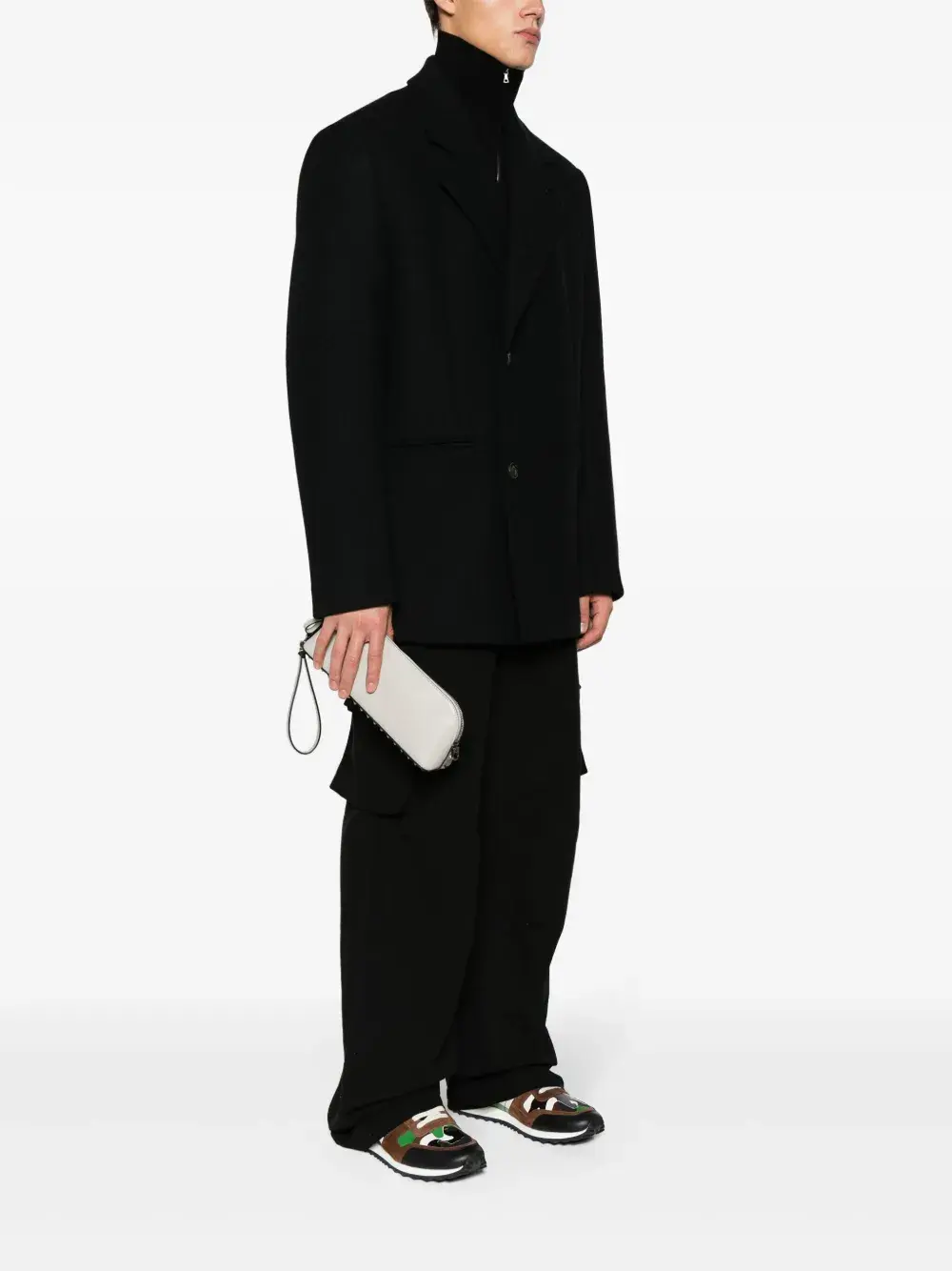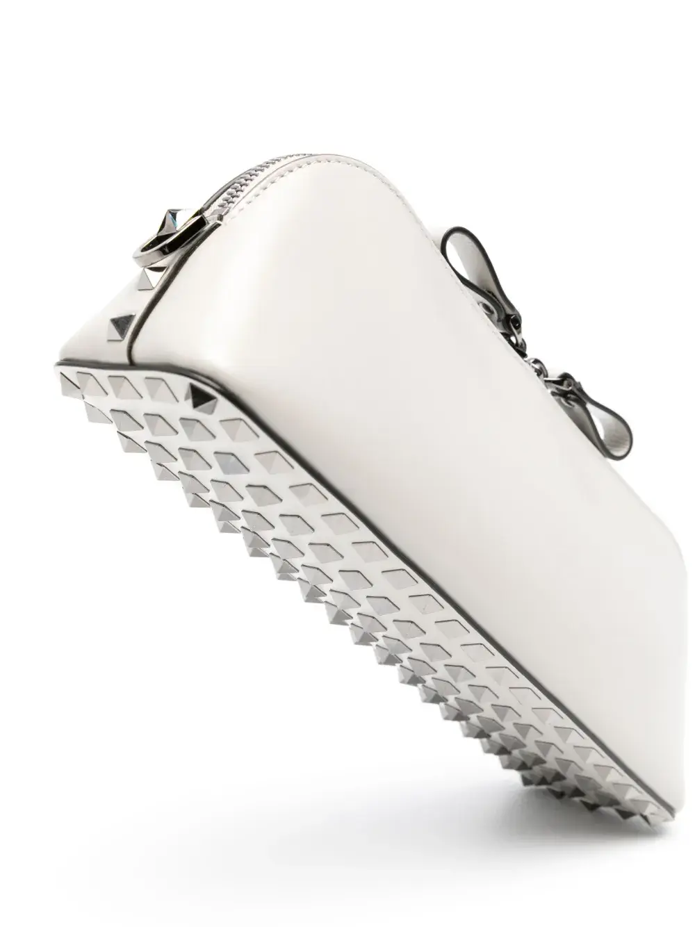 Серый, телячья кожа, гладкая текстура кожи, строчка в тон, серебристые заклепки Rockstud, серебристая фурнитура, тисненый логотип спереди, тисненый логотип внутри, застежка на молнии сверху, съемный ремешок на запястье, съемный ремень на плечо, основное отделение, внутренний прорезной карман, металлические ножки и кожаная подкладка. В комплект входит мешок-пыльник для хранения.