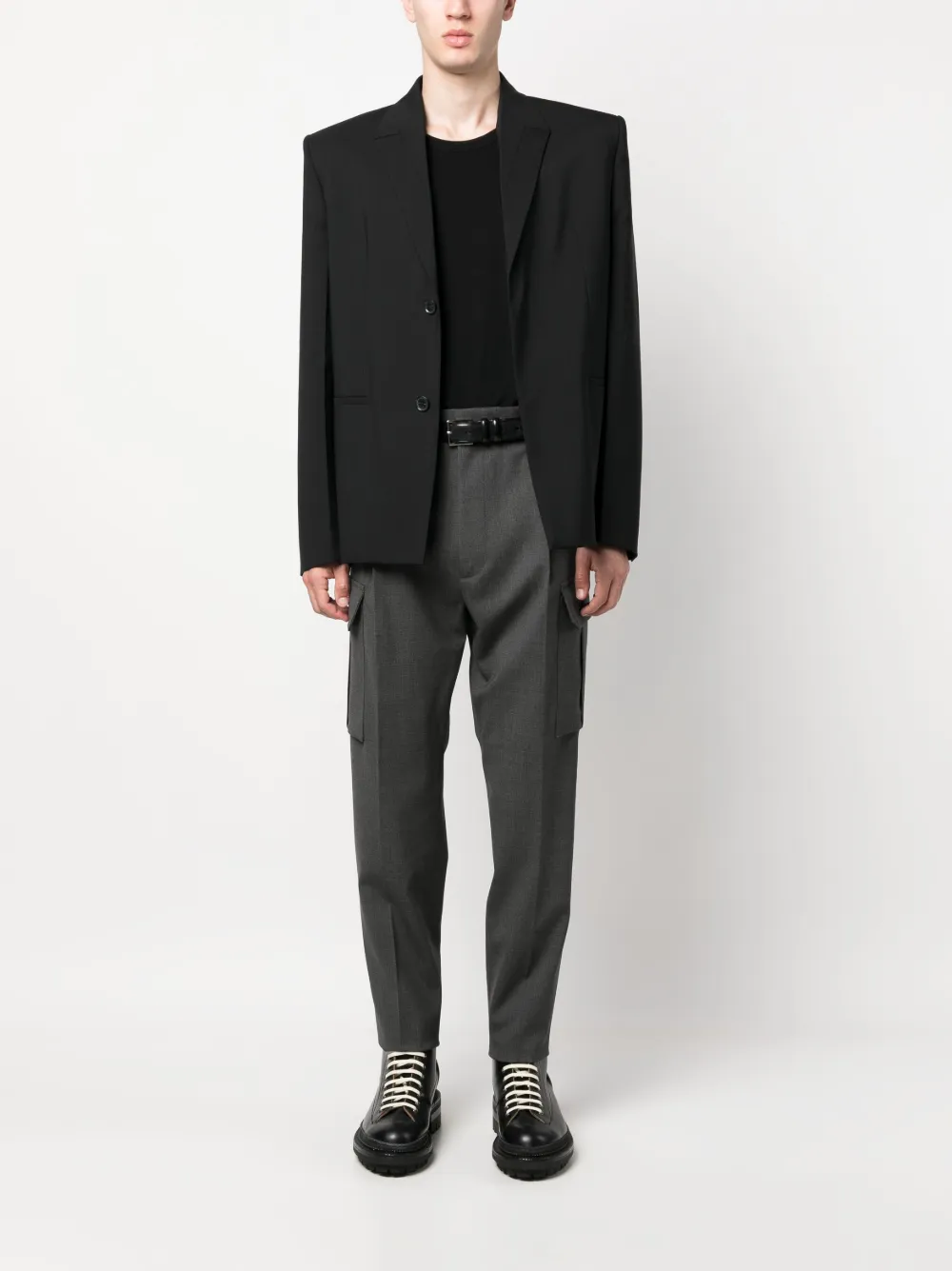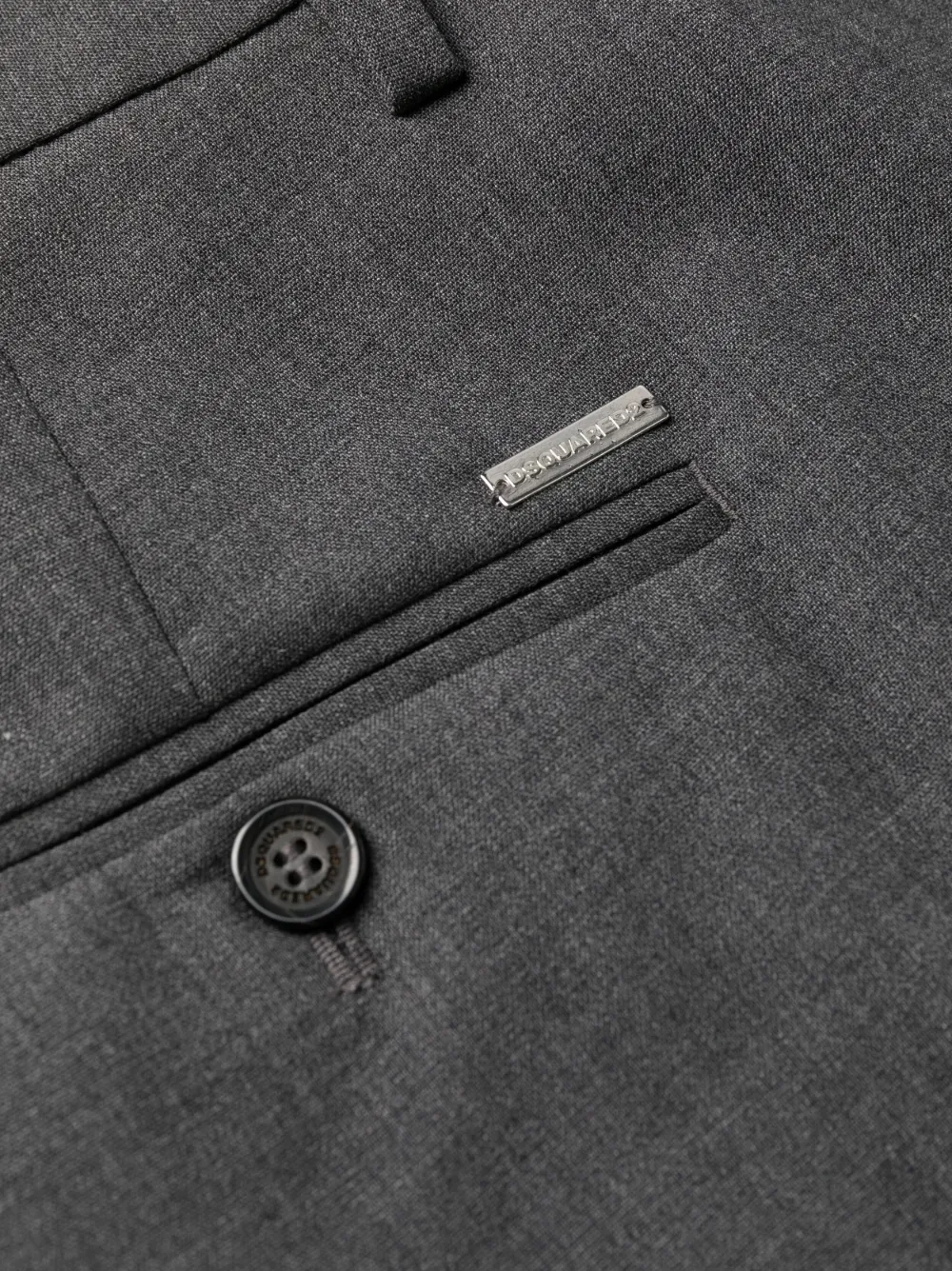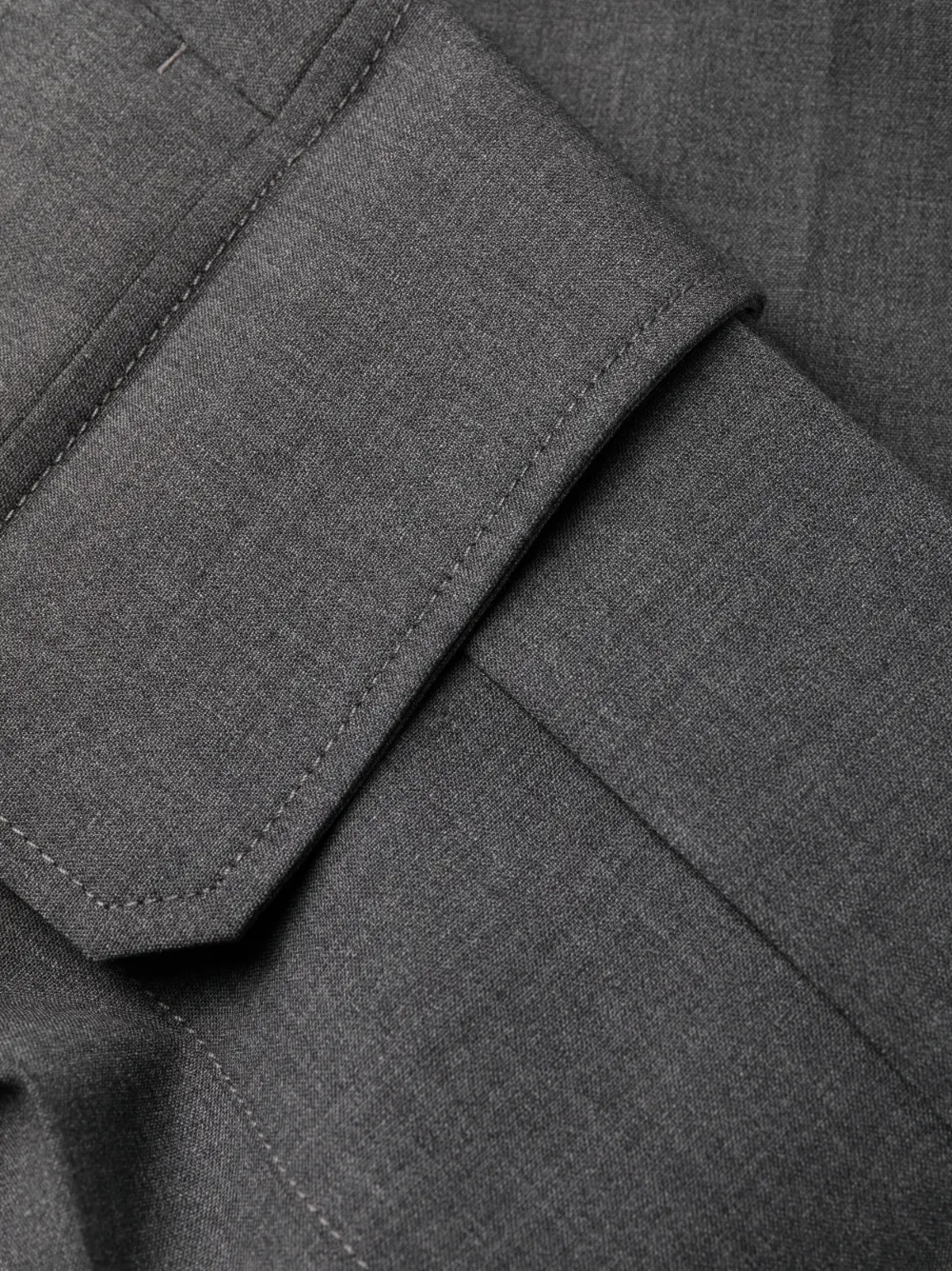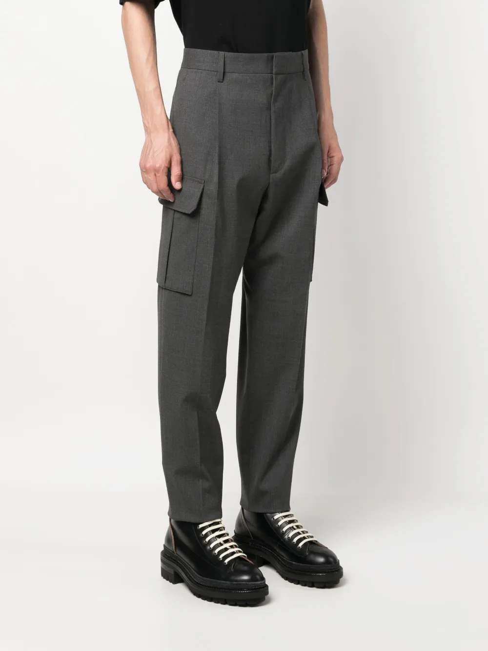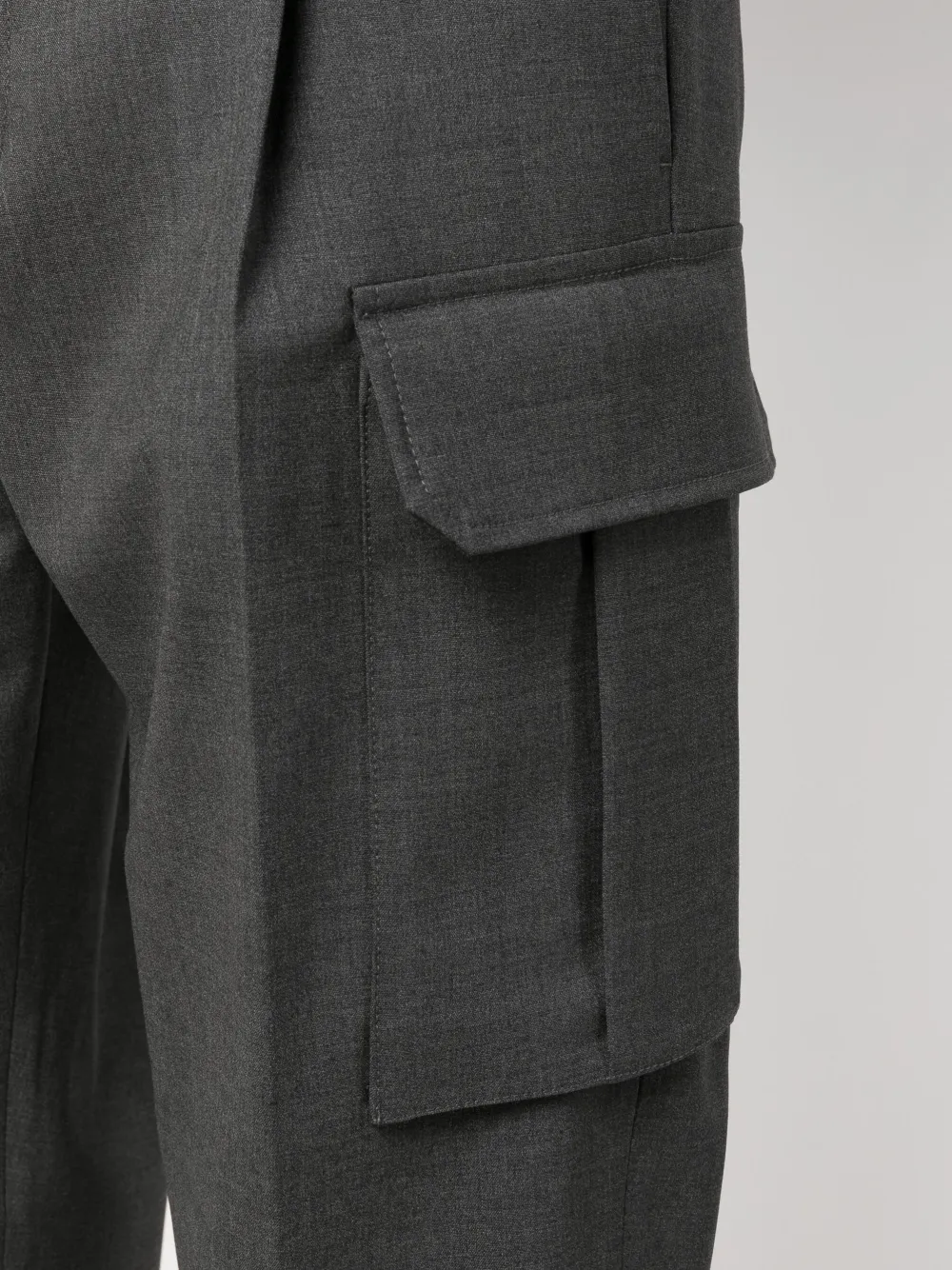 Пепельно-серый, смесовая необработанная шерсть, эластичный материал, средняя посадка, петли для ремня, потайная застежка спереди, низкий шаговый шов, два прорезных кармана по бокам, два накладных кармана по бокам, два прорезных кармана на пуговицах сзади и зауженный крой.