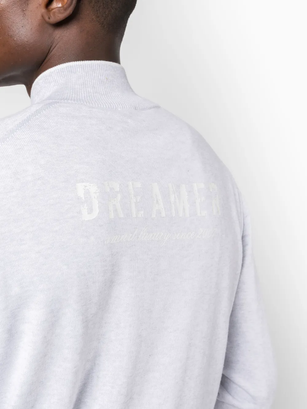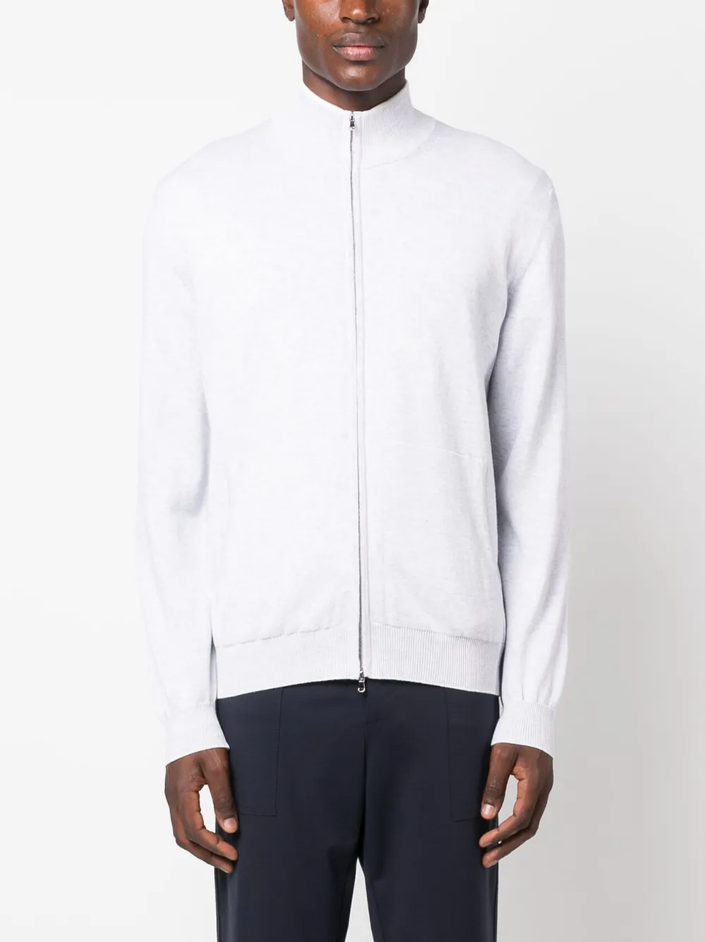 Светло-серый, хлопок, трикотажный материал, эффект меланж, принт с надписью сзади, воротник-стойка, двусторонняя молния спереди, длинные рукава и два передних кармана.