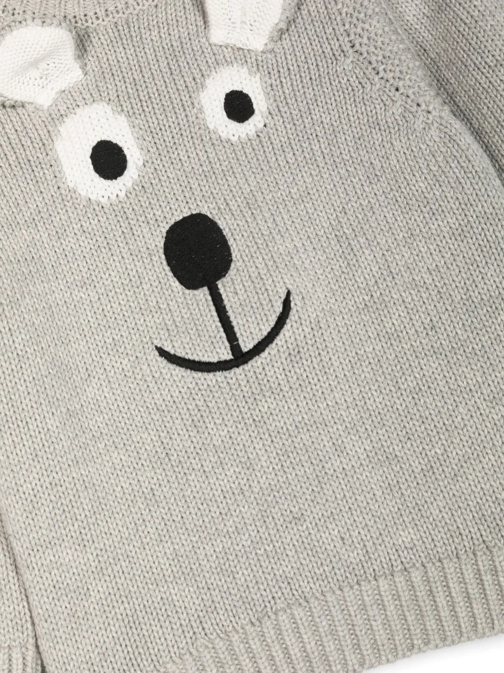 Серый, хлопок, вязка в технике интарсия, принт с изображением смайла, объемная аппликация, подол и манжеты в рубчик, круглый вырез, застежка на пуговицы, длинные рукава и прямой подол. Узнать больше о том, какие товары получают отметку «Ответственный выбор», можно из материала «Как мы оцениваем экологичность и этичность».