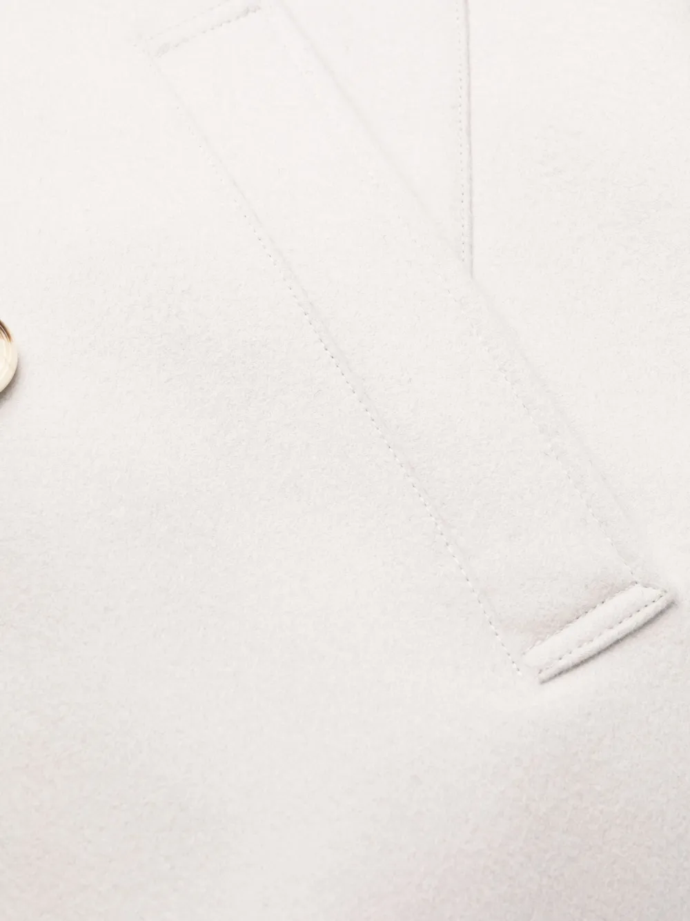 Светло-серый, смесь шерсти и кашемира, высокий воротник, длинные рукава, двубортная застежка на кнопки и два прорезных кармана сбоку.
