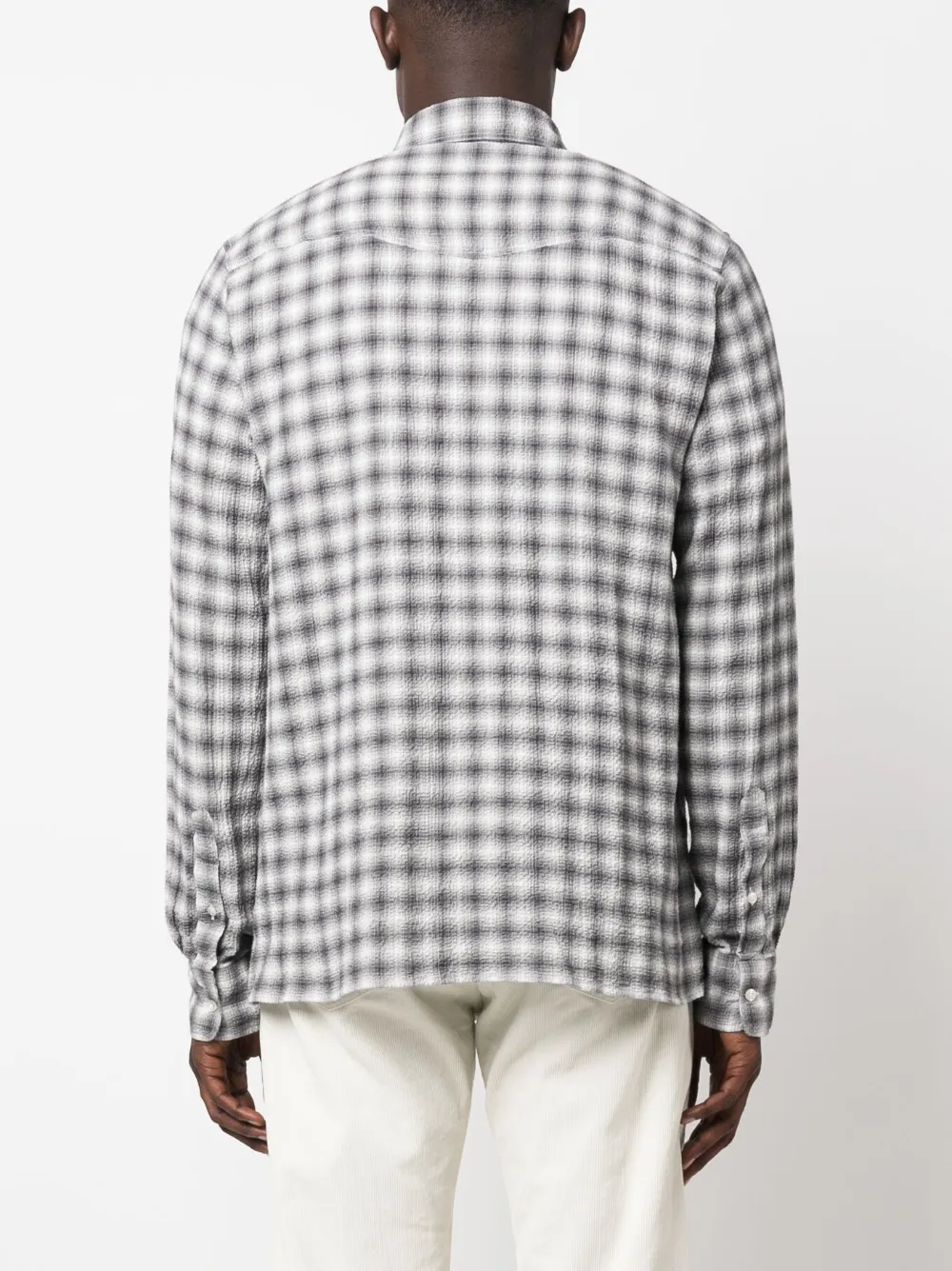 Угольно-серый, молочно-белый, эластичный хлопок, сплошной графичный принт, сирсакер, плоский заостренный воротник, застежка на пуговицах спереди, нагрудный накладной карман, длинные рукава, манжеты на пуговицах и прямой подол.
