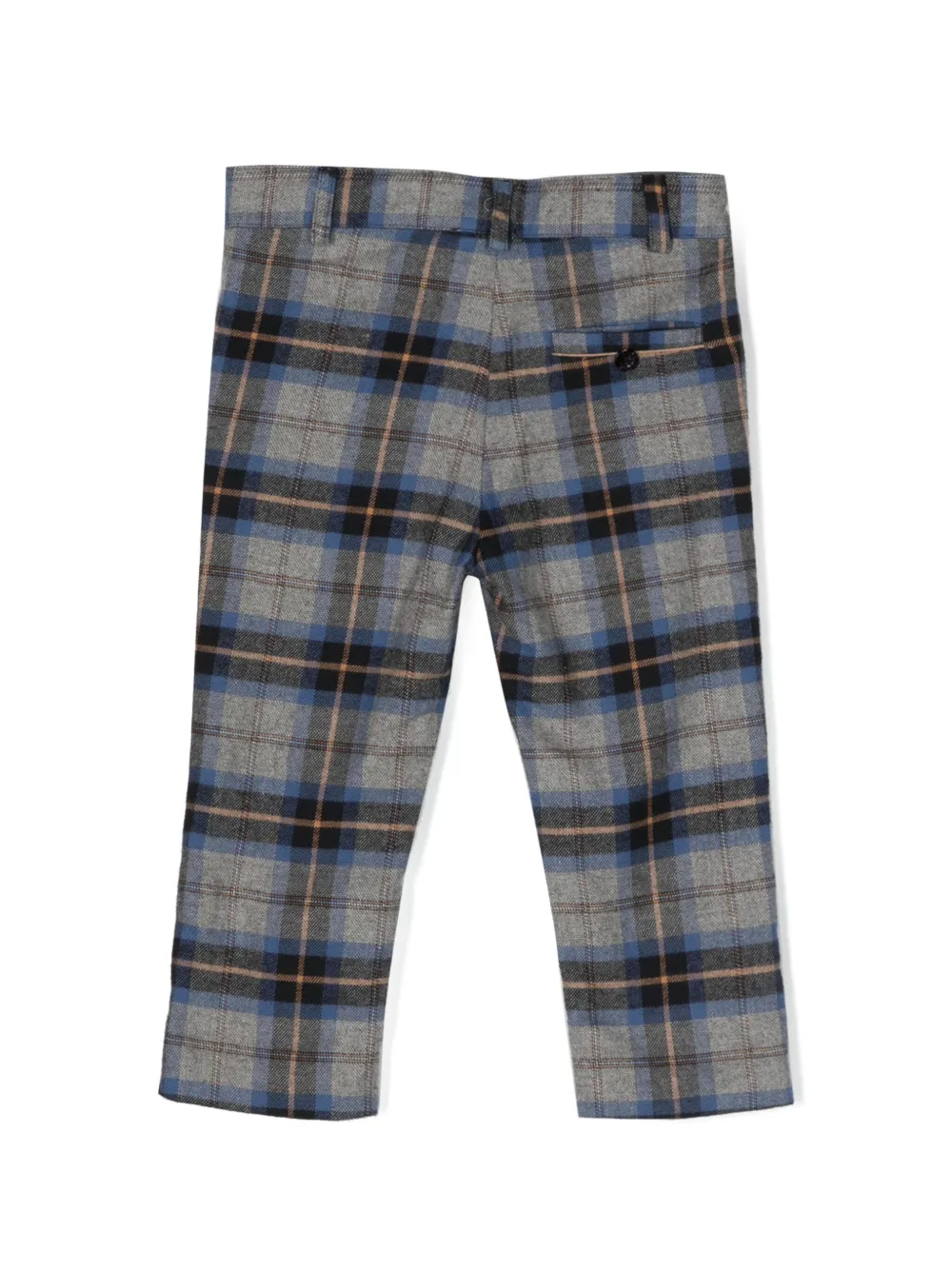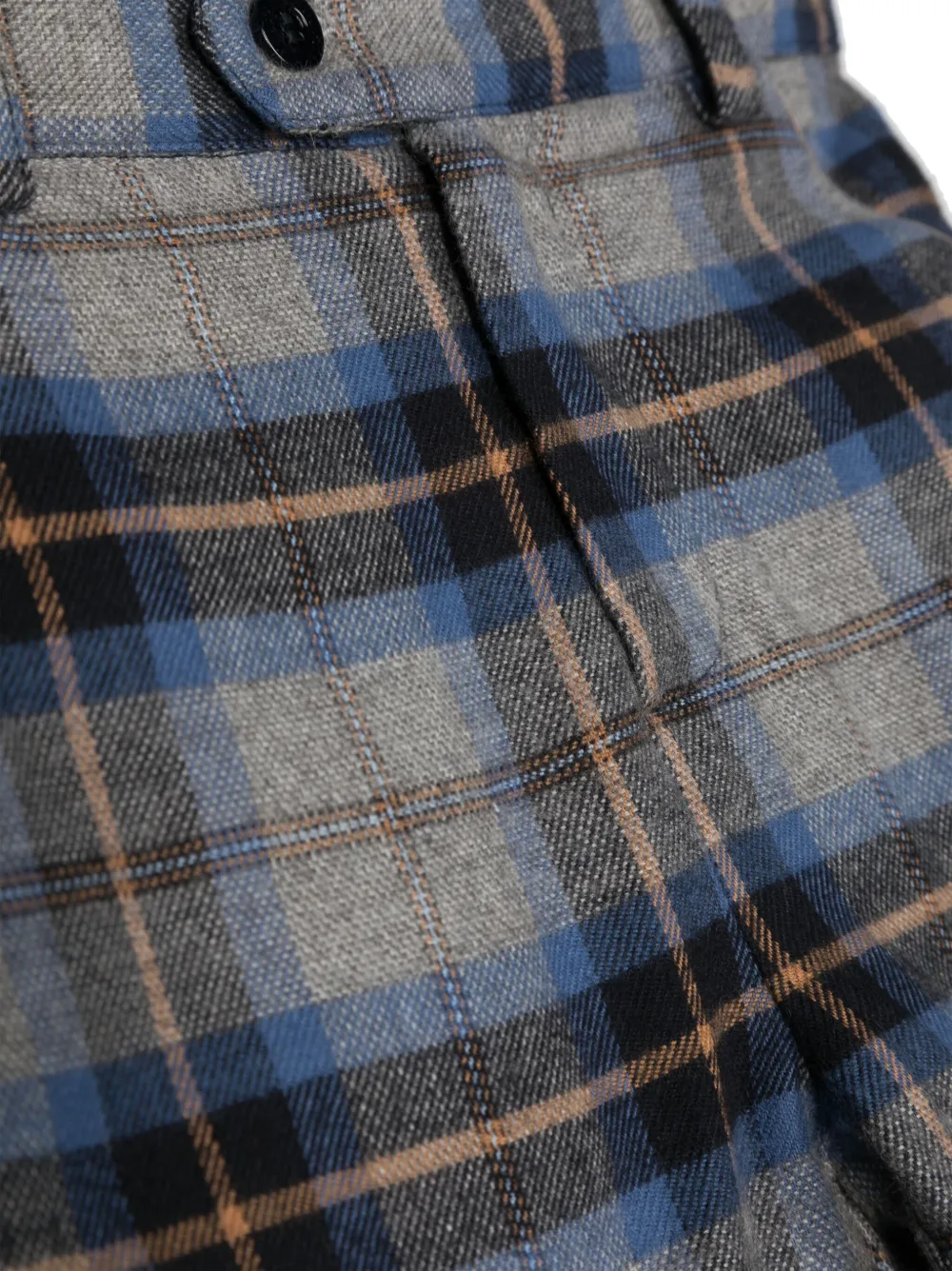 Серый, разноцветный, хлопок, клетчатый узор, петли для ремня, смещенная застежка спереди, два кармана по бокам и прорезной карман на пуговице сзади.