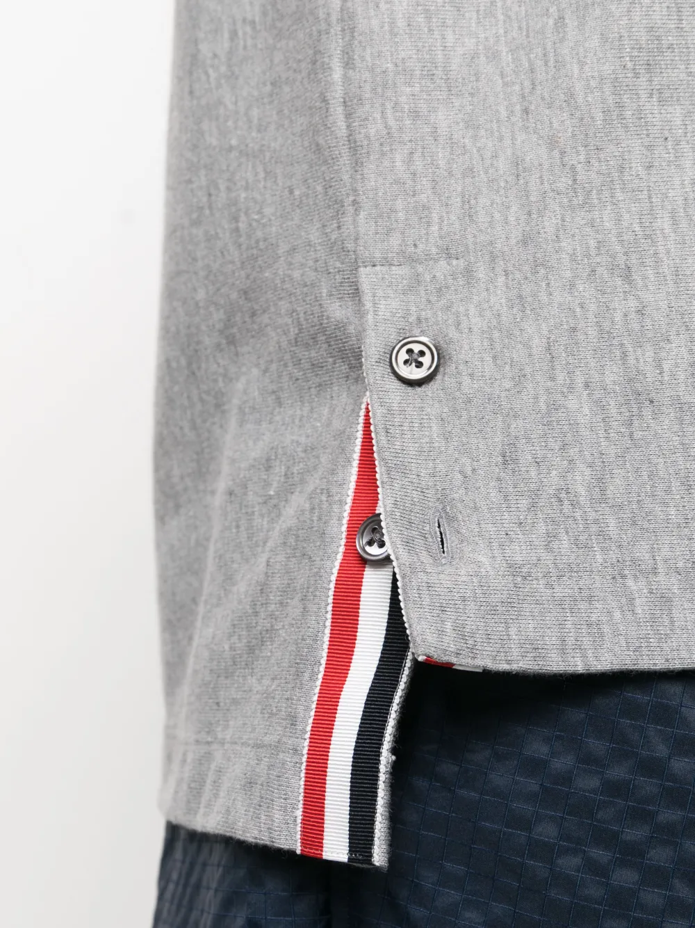 Светло-серый, красный, темно-синий, хлопок, ткань джерси, отделка корсажной лентой, полоски RWB, знаковая деталь в полоску по бокам, круглый вырез, короткие рукава и манжеты со ступенчатой отделкой.