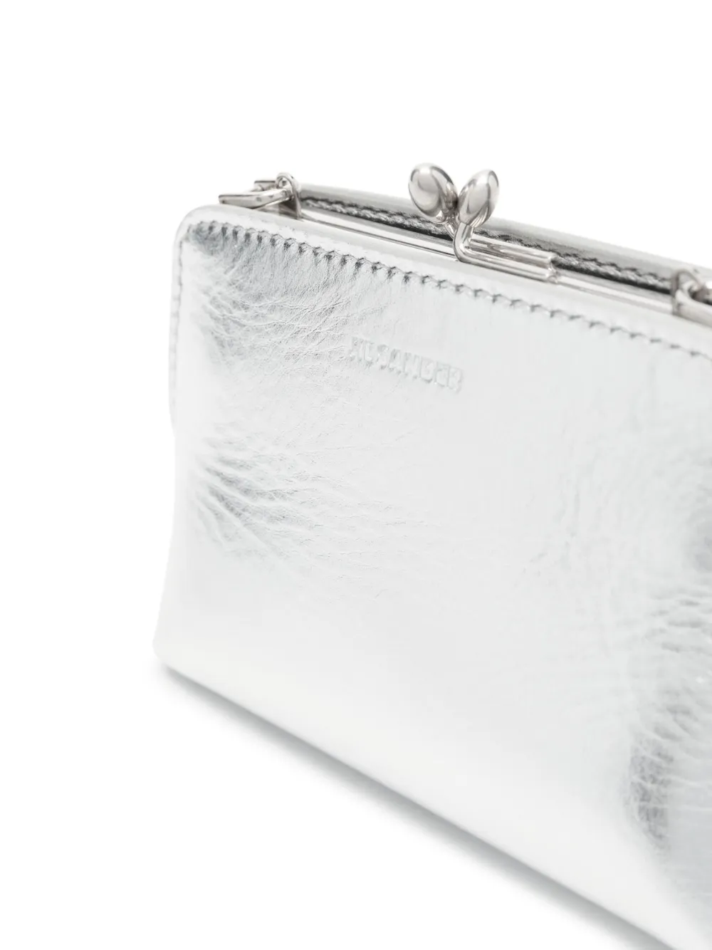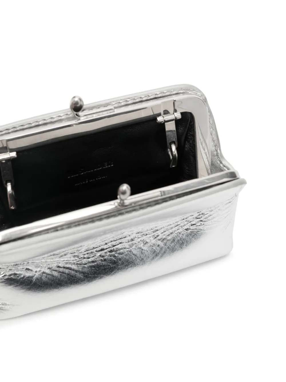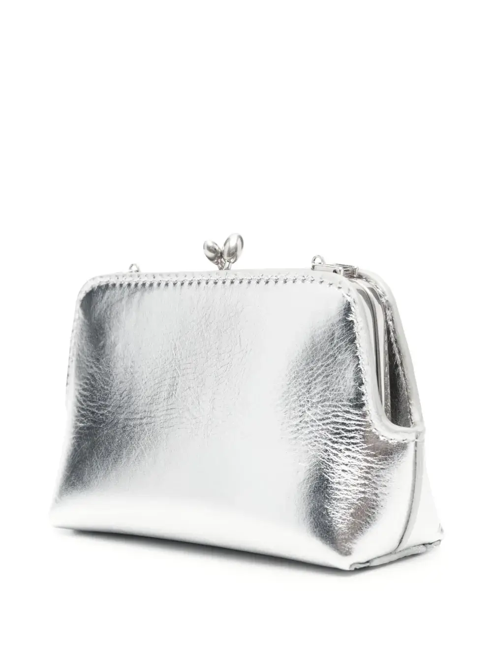 Серебристый, телячья кожа, покрытие с эффектом металлик, серебристая фурнитура, тисненый логотип спереди, застежка на защелку, съемный регулируемый ремень на плечо и основное отделение.