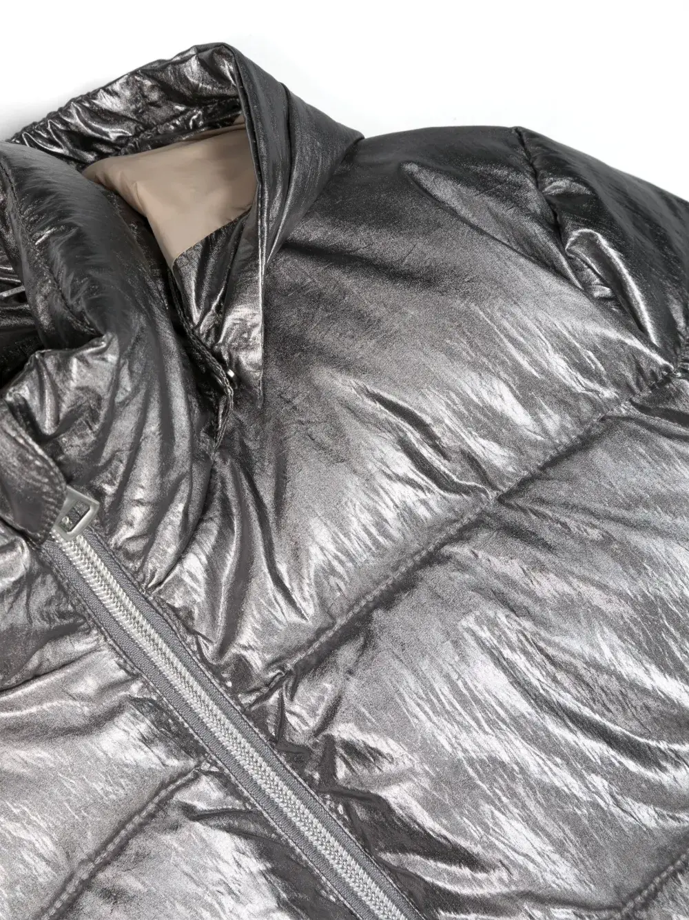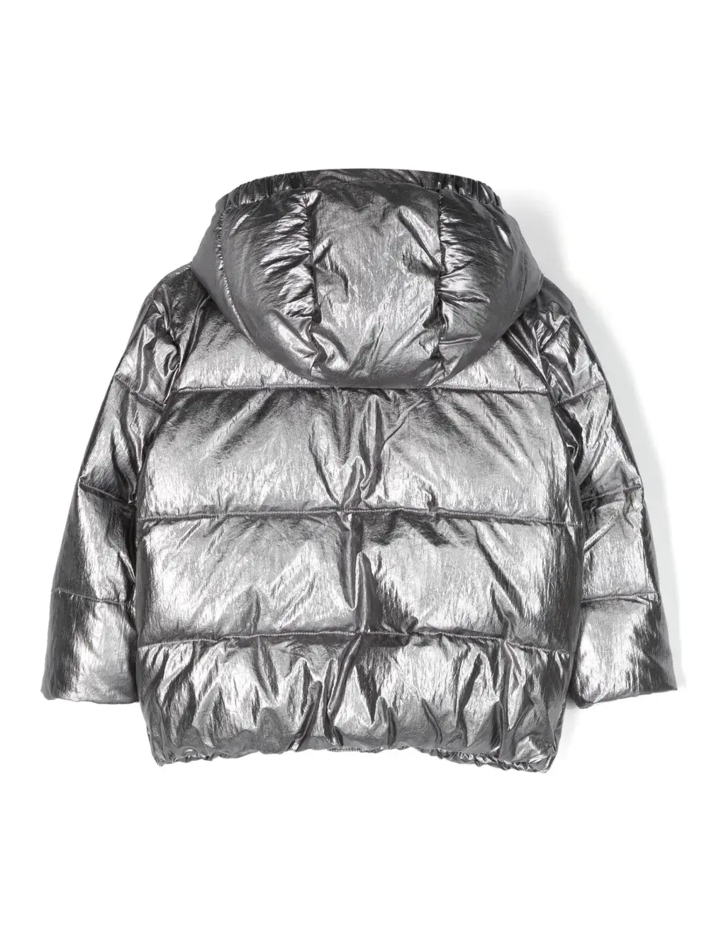 Серебристый, покрытие с эффектом металлик, дутый материал, нашивка с логотипом на рукаве, классический капюшон, застежка на молнии спереди, длинные рукава, два прорезных кармана по бокам и прямой подол.