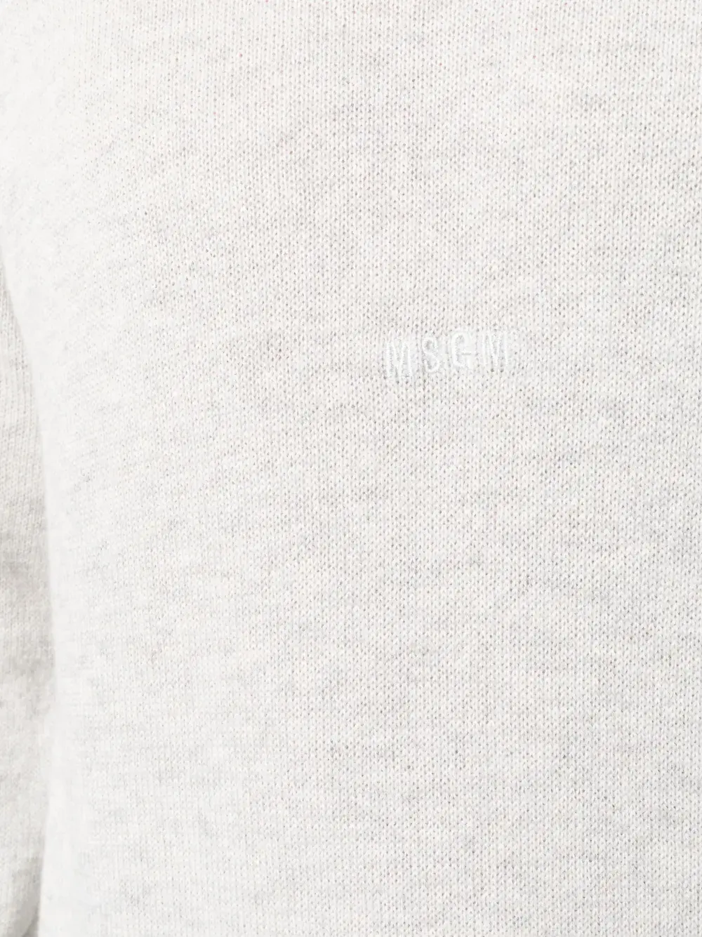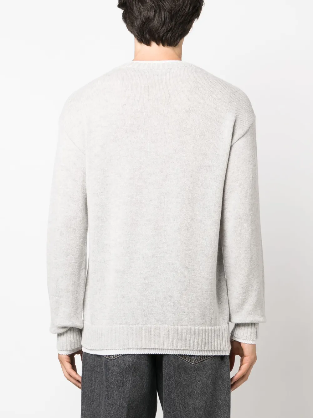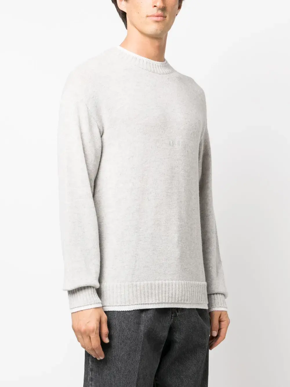 Светло-серый, смесь шерсти и кашемира, эффект меланж, длинные рукава, круглый вырез и вязаные края в рубчик.