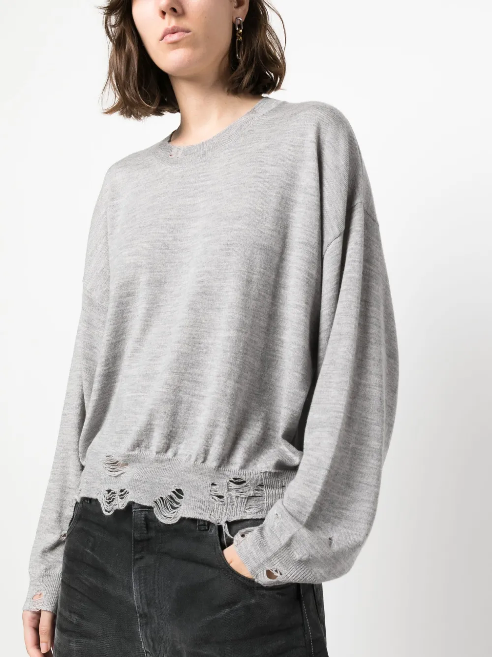 Светло-серый, шерсть мериноса, трикотажный материал, эффект меланж, эффект потертости, круглый вырез, длинные рукава и асимметричный подол.