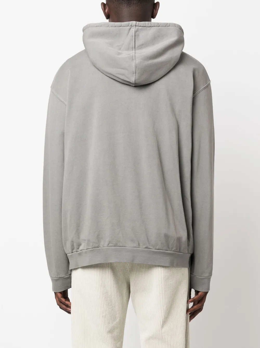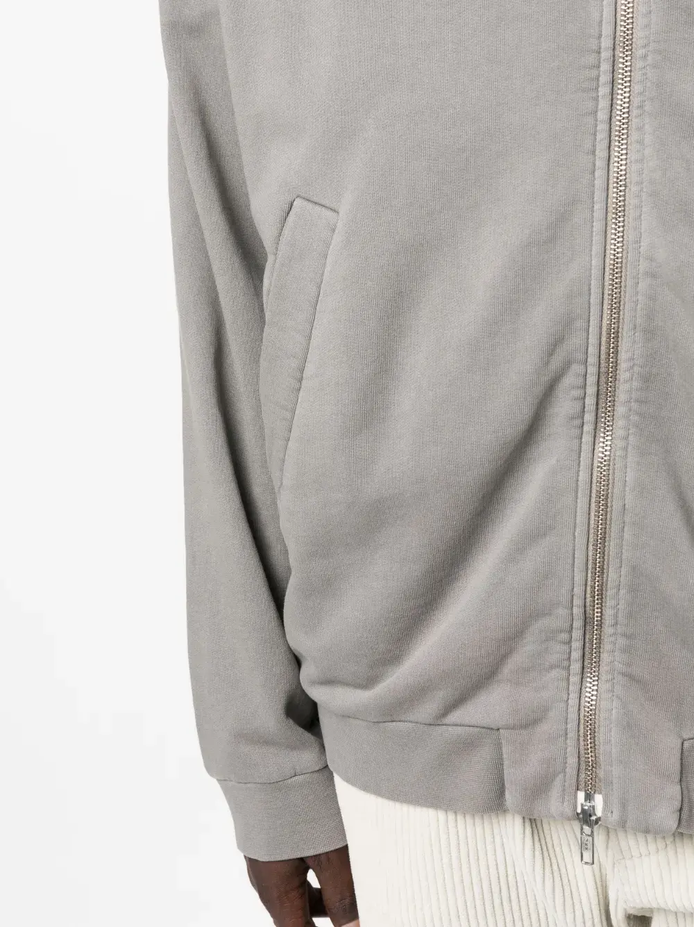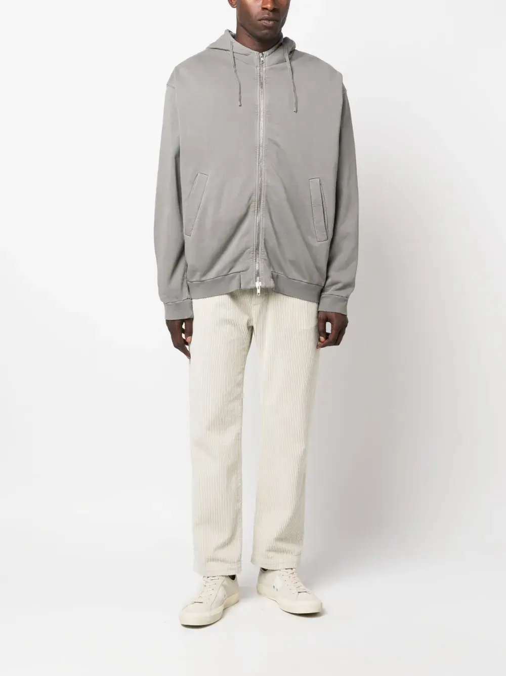 Светло-серый, хлопок, затягивающийся на шнурок капюшон, высокий воротник, двусторонняя молния спереди, приспущенные плечи, длинные рукава, два прорезных кармана по бокам и прямой подол.