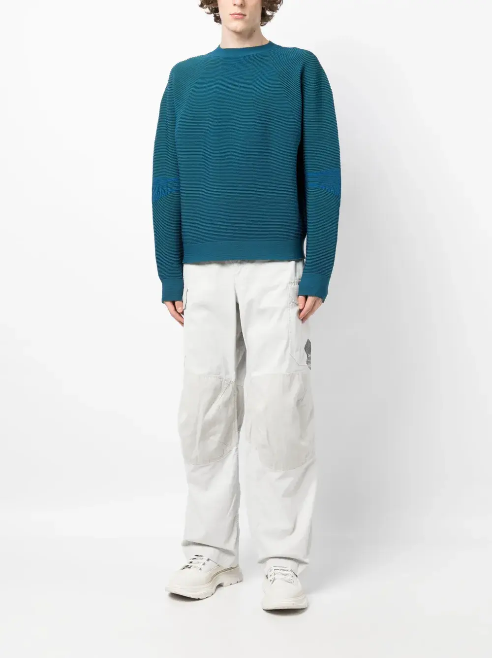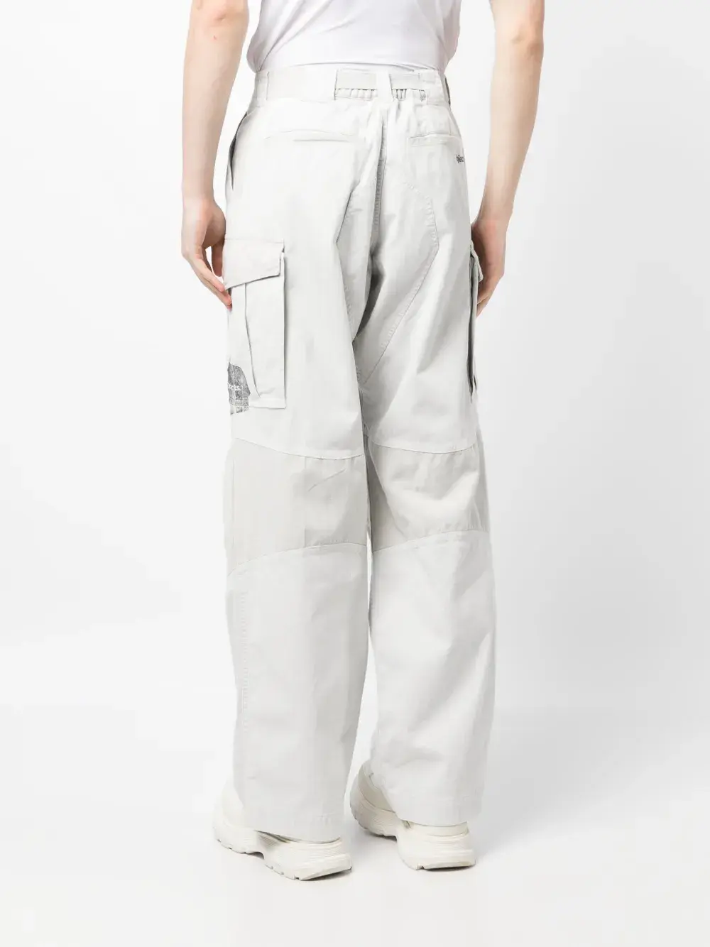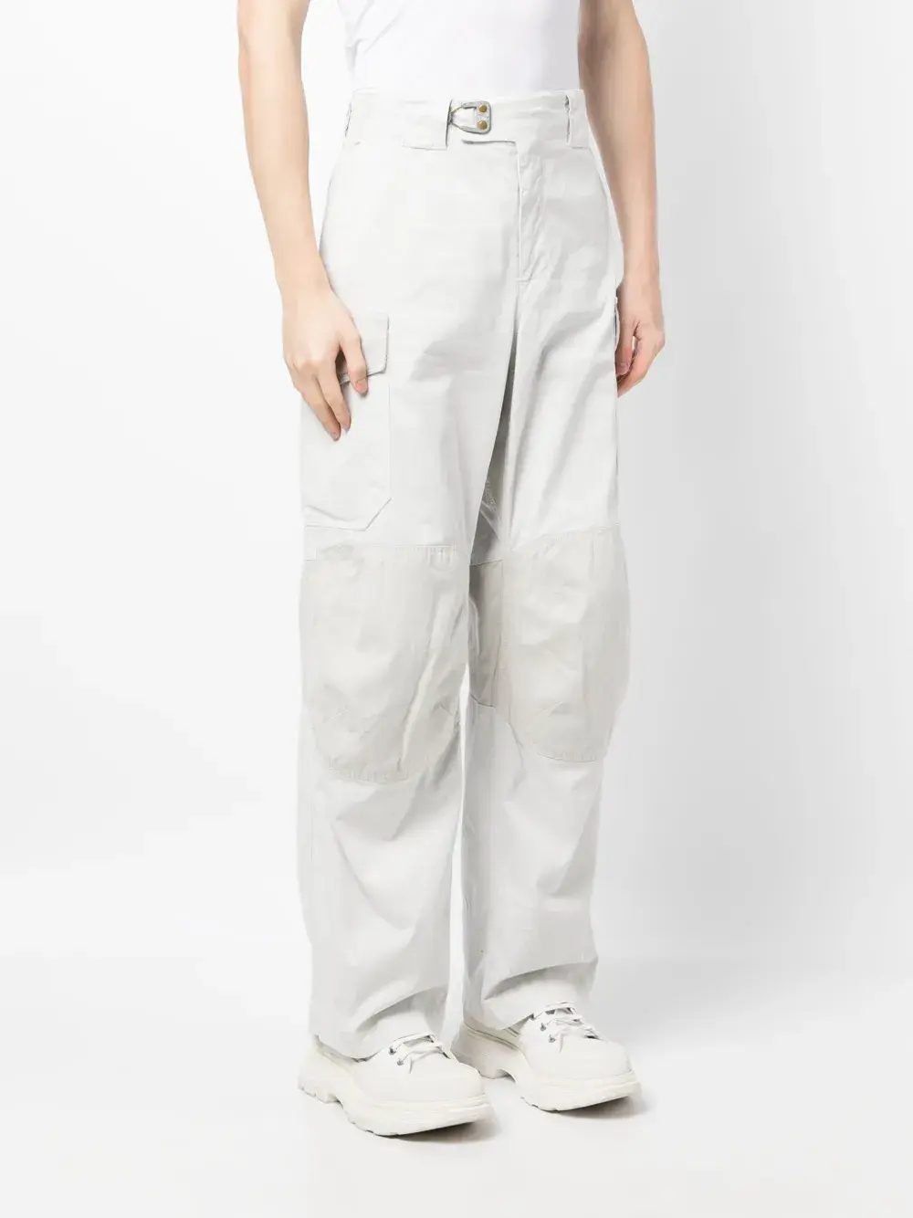 Светло-серый, эластичный хлопок, петли для ремня, застежка на молнии и пуговице спереди, прямой крой, два прорезных кармана по бокам, два кармана с клапанами по бокам и два кармана с листочкой сзади.