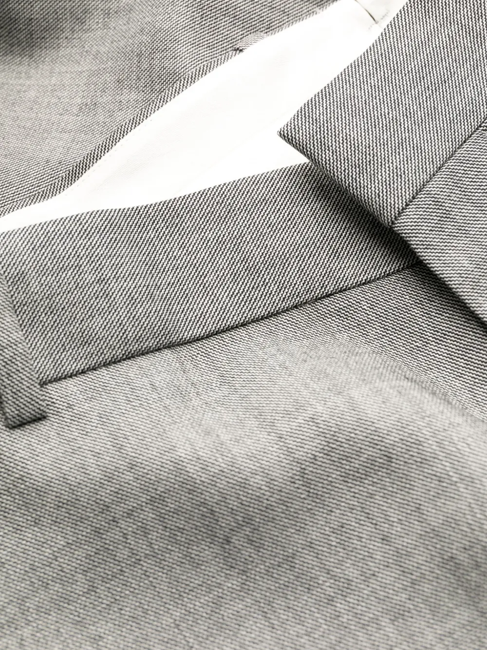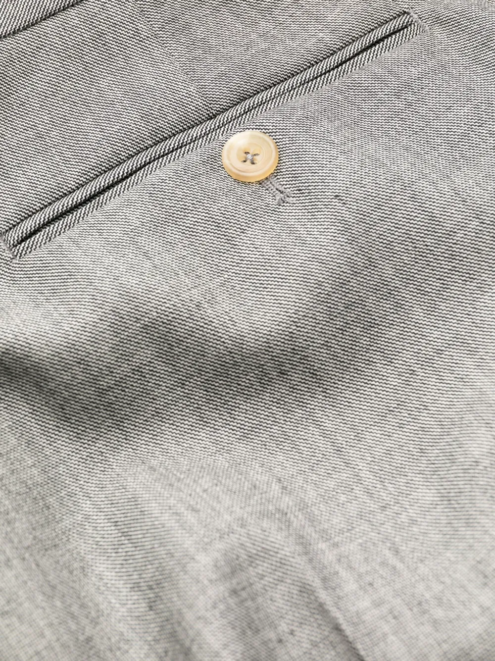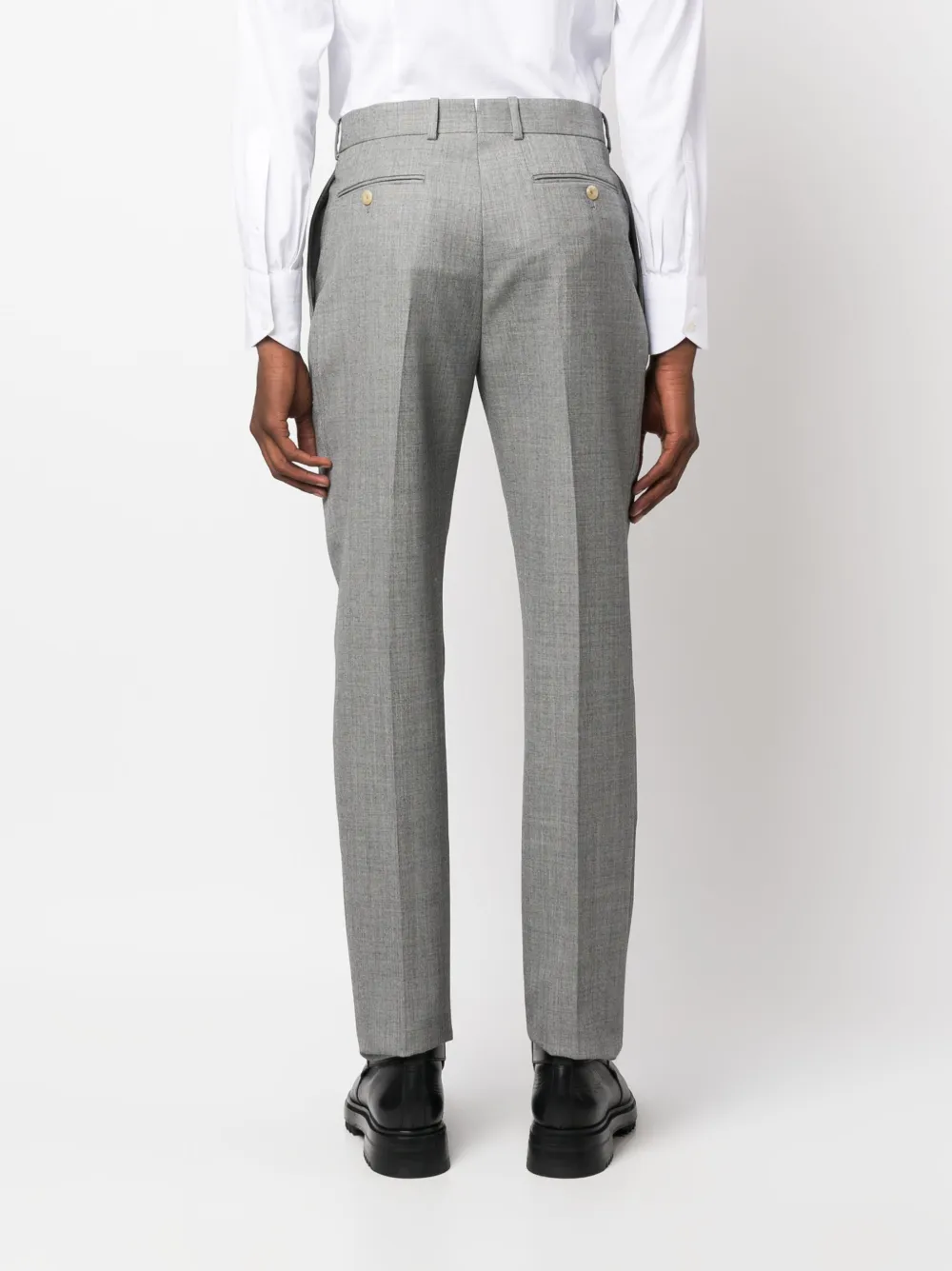 Серый, шерсть, петли для ремня, стрелки, прямой крой, потайная застежка спереди и два прорезных кармана на пуговицах сзади.