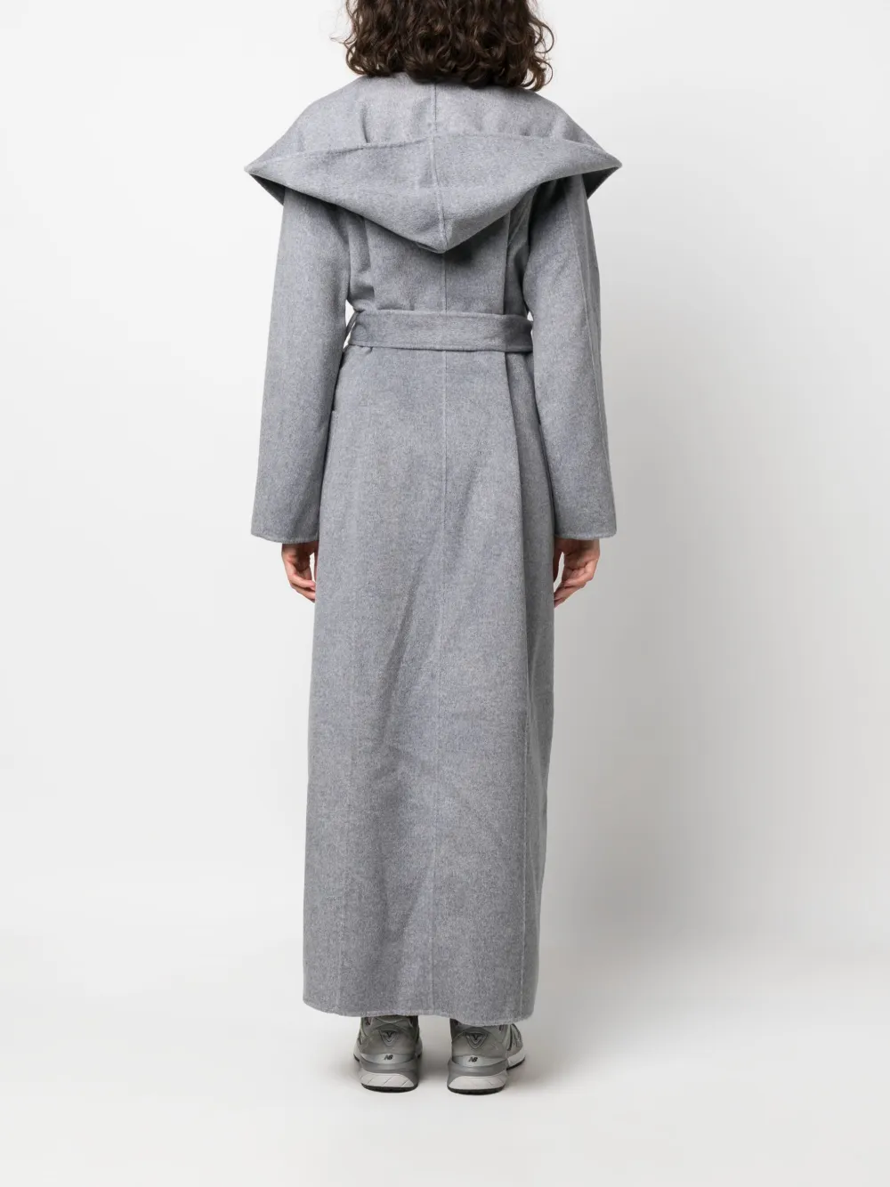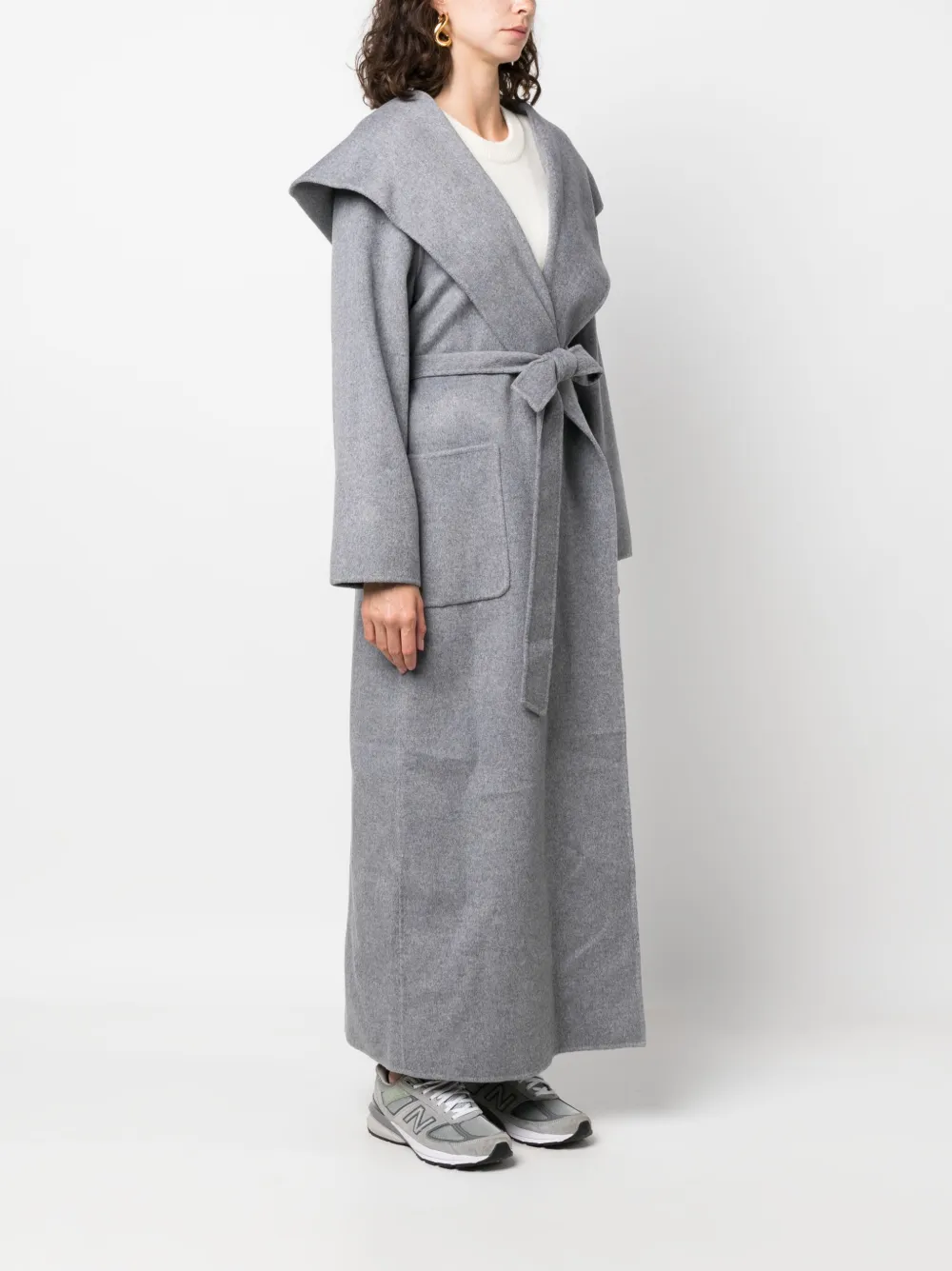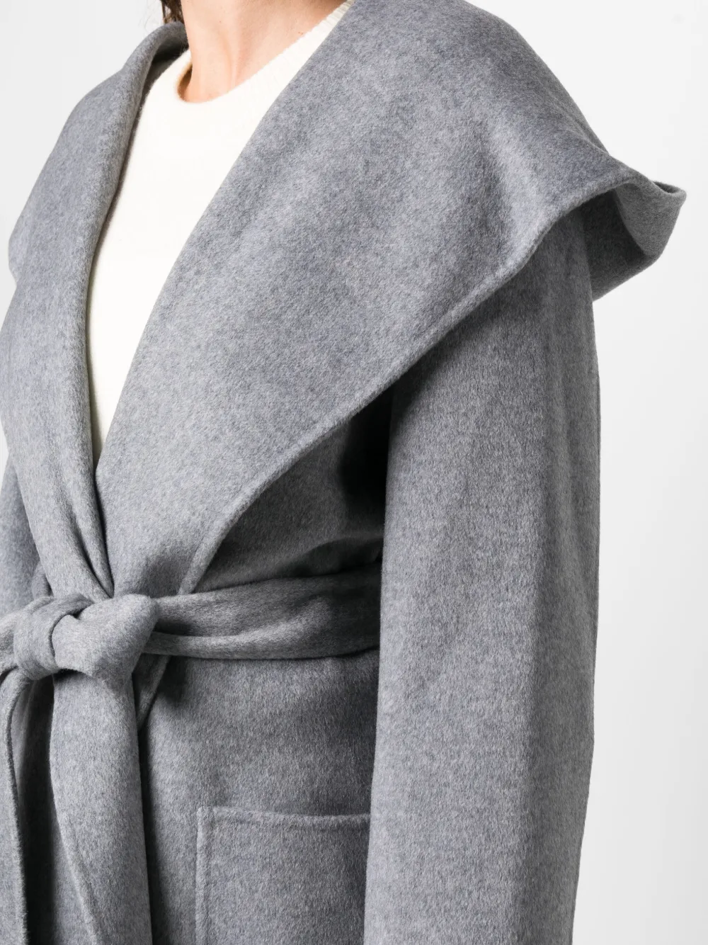 Серый, кашемир, объемный капюшон, модель без застежки, длинные рукава, ремень на талии, два накладных кармана спереди и высота по щиколотку.