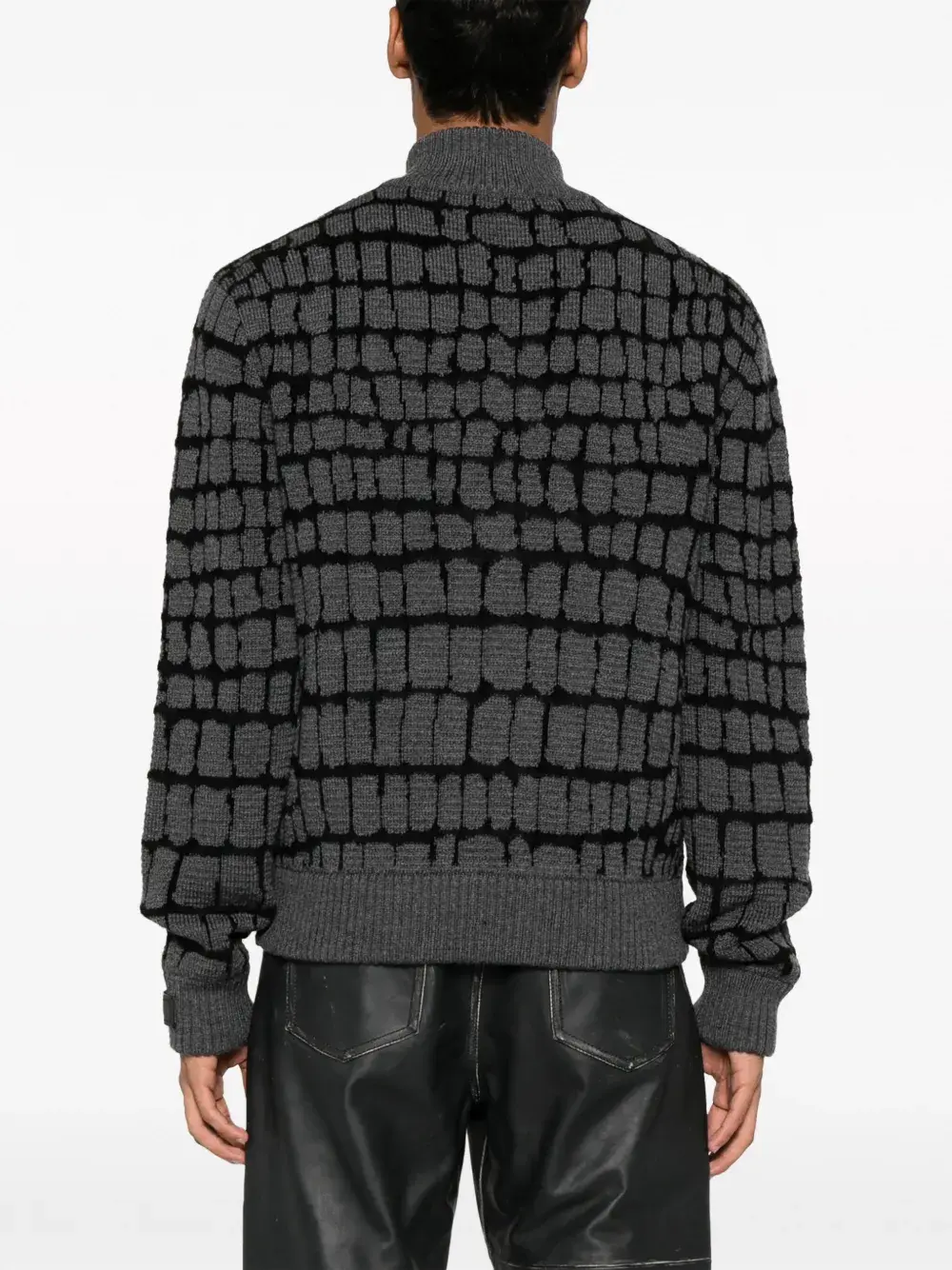 Черный/серый, смесовая необработанная шерсть, вязка в технике интарсия, высокий воротник, длинные рукава, застежка на молнии спереди, два вшитых кармана по бокам и прямой подол.