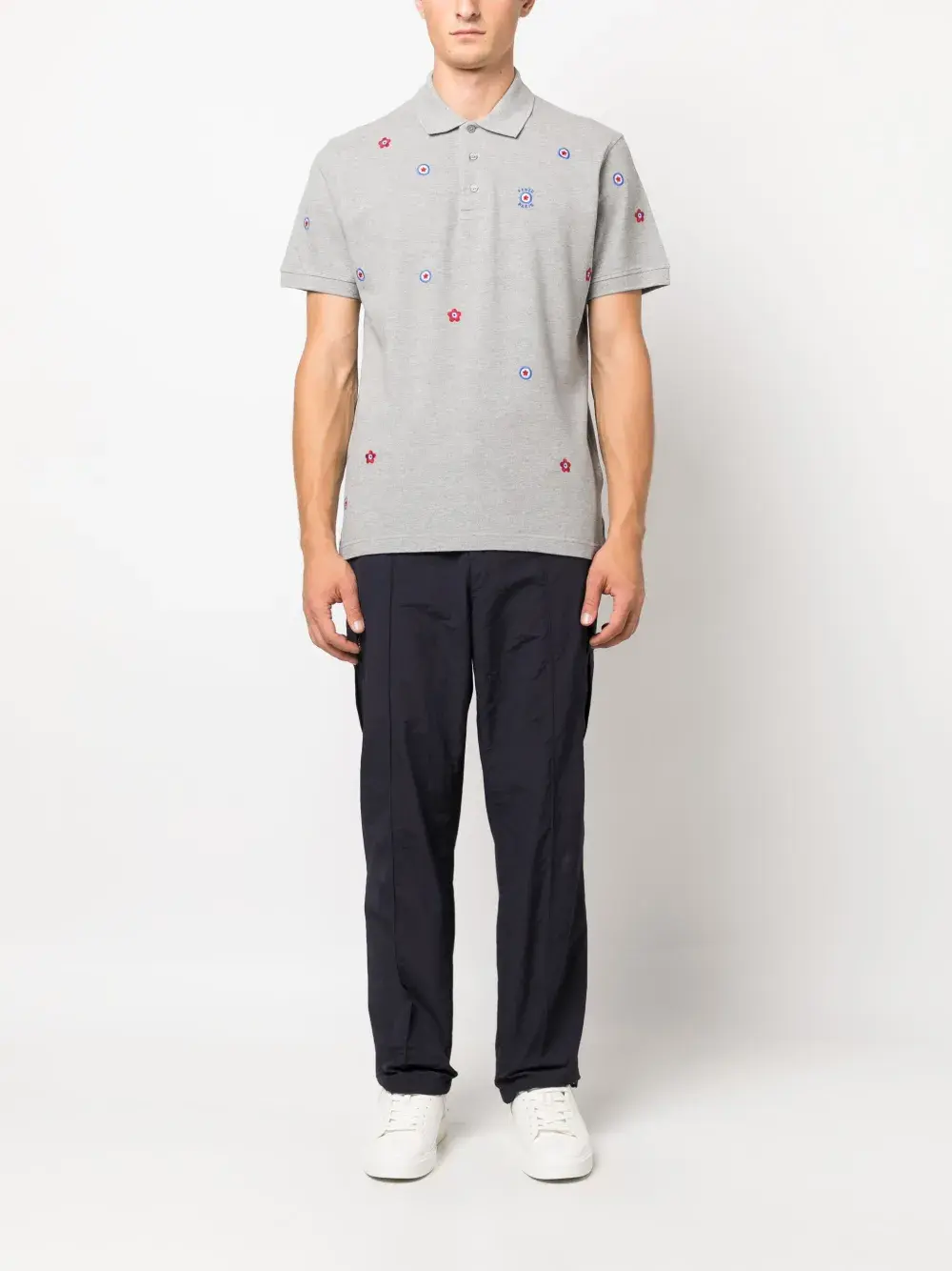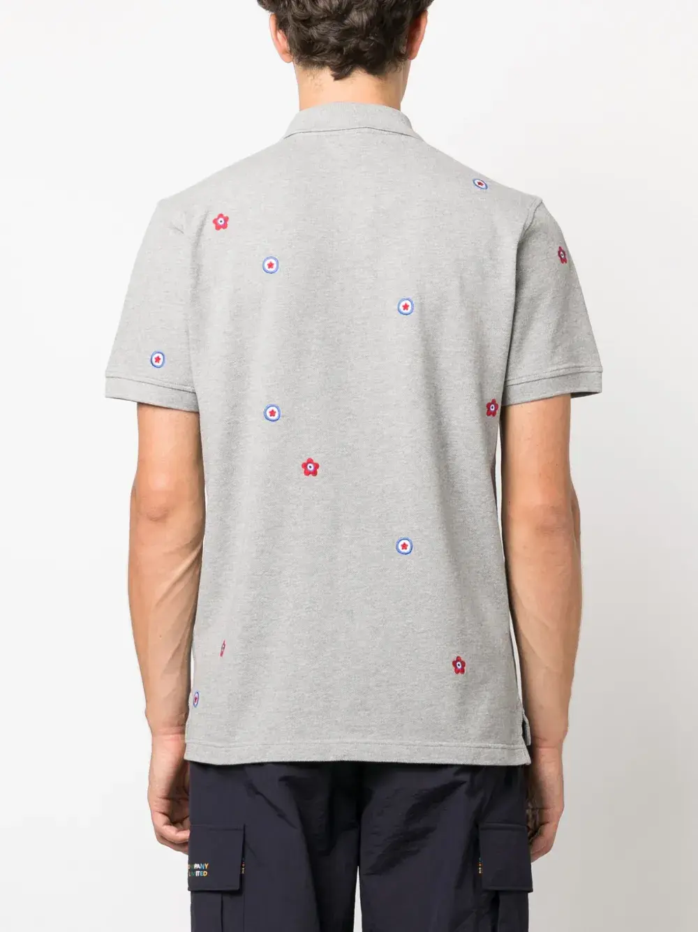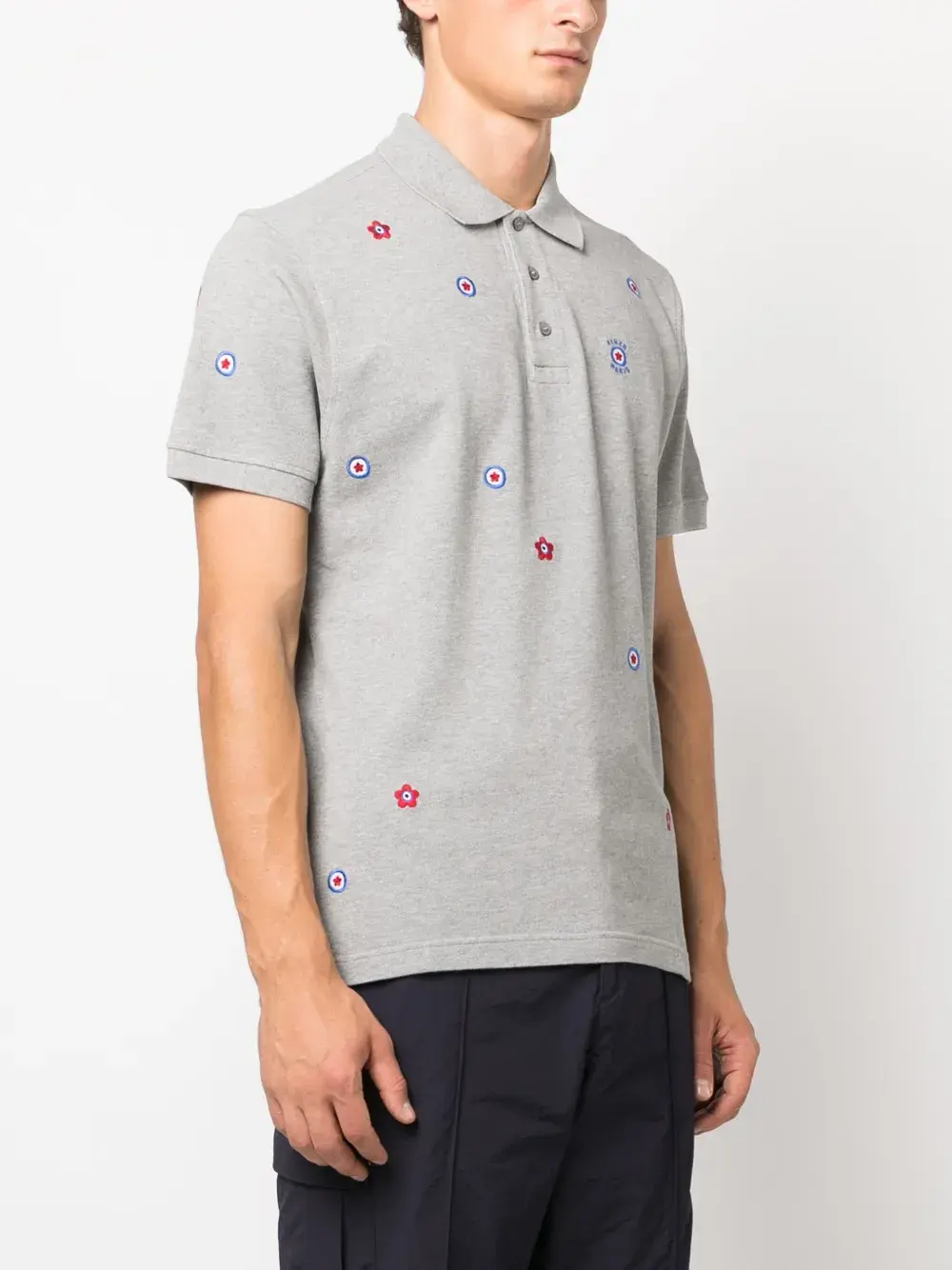 Серый, хлопок, ткань пике, вышитые узоры, воротник поло, планка на пуговицах спереди, короткие рукава и прямой подол.