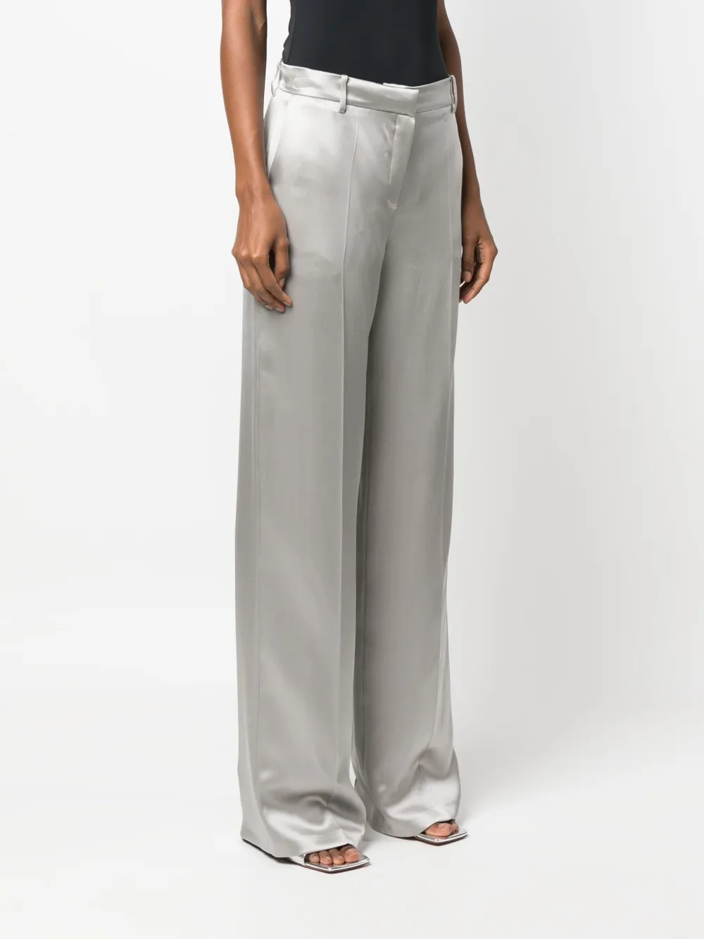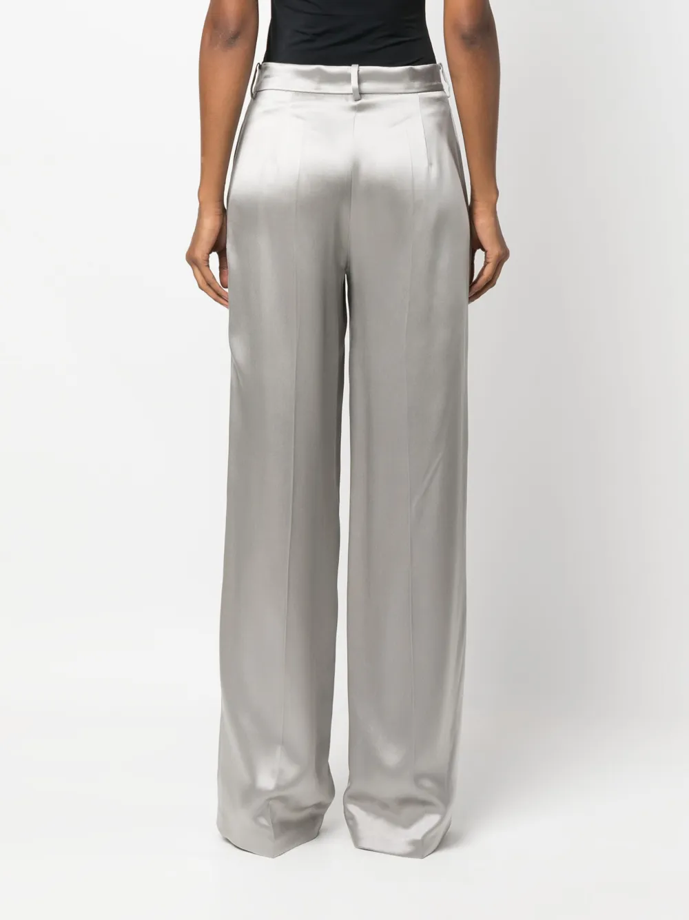 Пепельно-серый, шелк, завышенная талия, потайная застежка спереди, петли для ремня, складки и широкий крой.