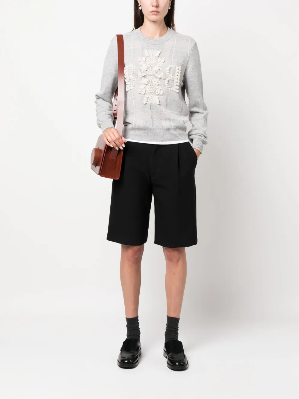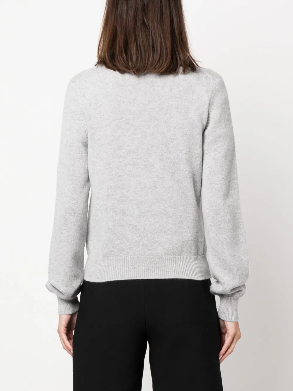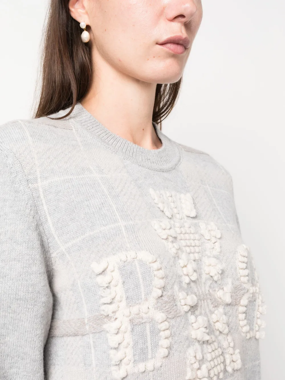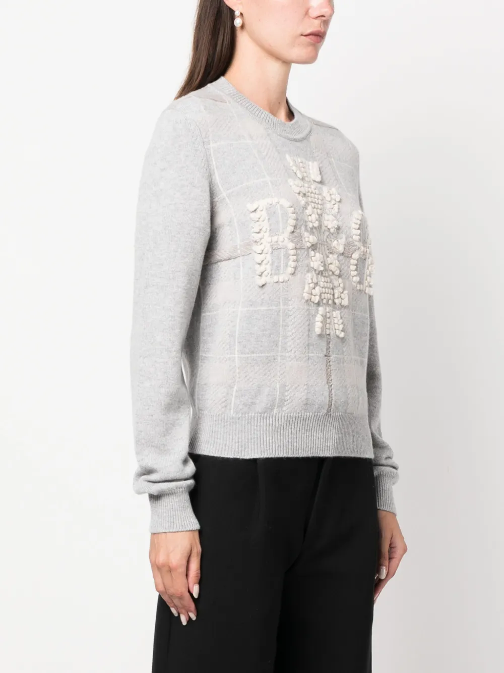 Светло-серый, кремово-белый, кашемир, трикотаж в рубчик, ткань букле, узор в клетку тартан, вышитый логотип спереди, круглый вырез и длинные рукава.