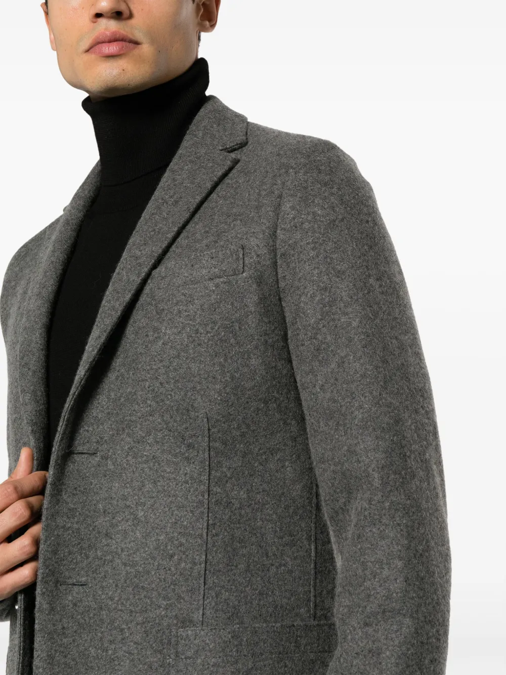 Серо-коричневый, кашемир, фетровый материал, зазубренные лацканы, застежка на пуговицах спереди, длинные рукава, прорезной карман на груди, два накладных кармана по бокам и прямой подол. Узнать больше о том, какие товары получают отметку «Ответственный выбор», можно из материала «Как мы оцениваем экологичность и этичность».