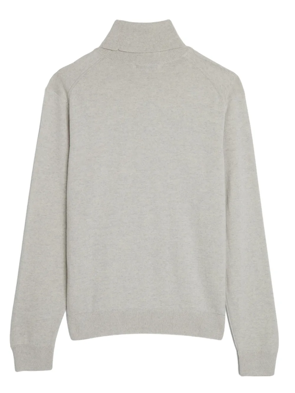 Светло-серый, шерсть, трикотажный материал, нашивка с логотипом на груди, отделка в рубчик, высокий воротник, длинные рукава и прямой подол.