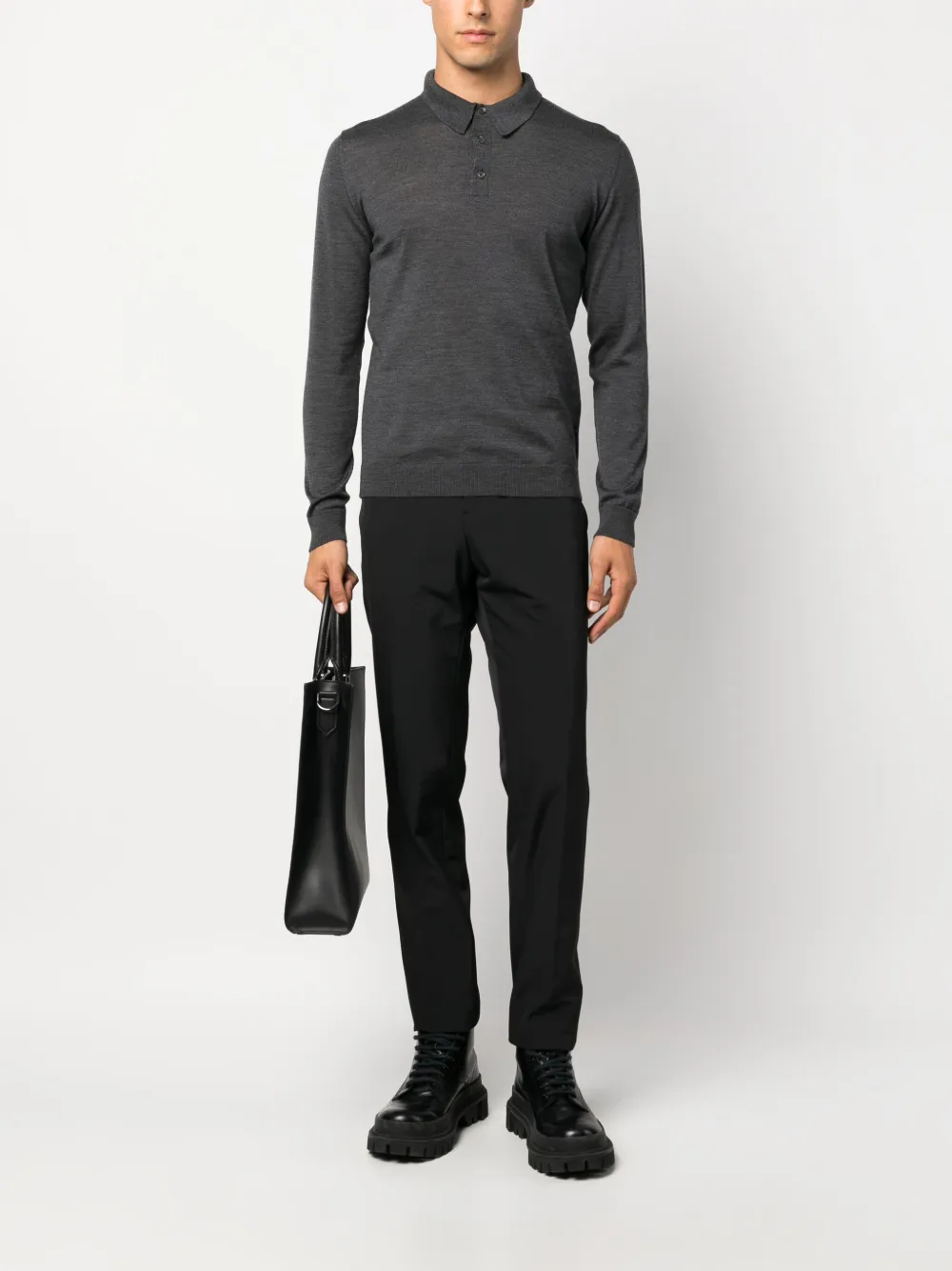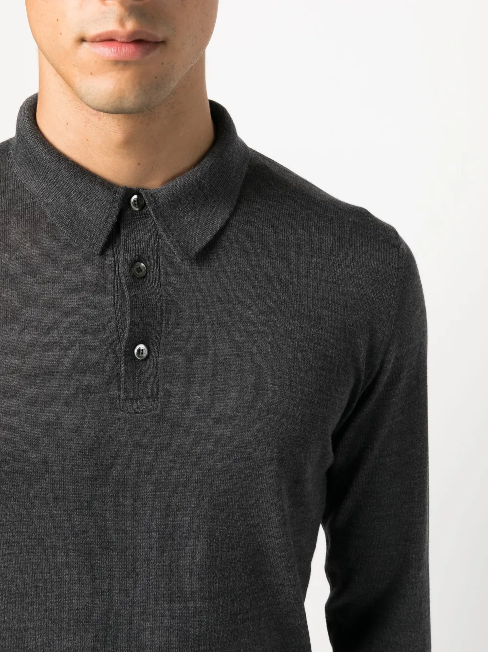 Антрацитово-серый, шерсть мериноса, эффект меланж, воротник поло, планка на пуговицах спереди, длинные рукава и прямой подол.