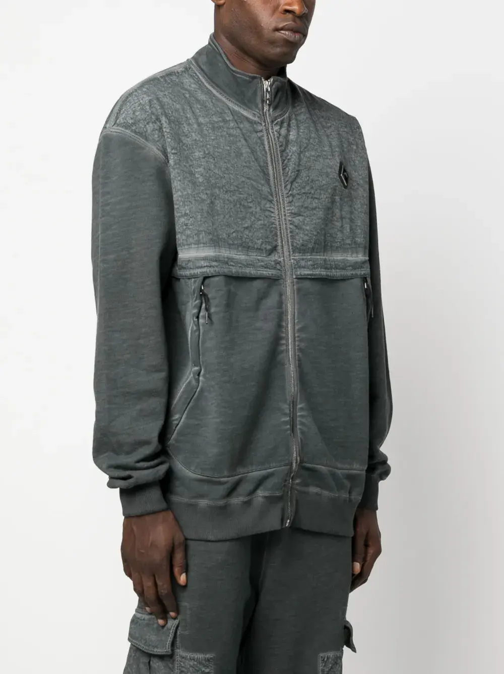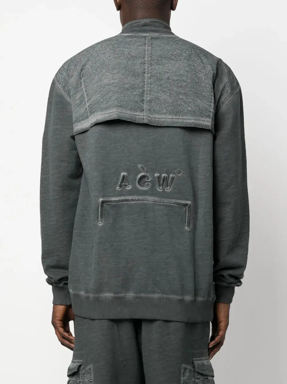 Серый, хлопок, стиль колор-блок, нашивка с логотипом на груди, вышитый логотип сзади, нашивка с логотипом на рукаве, эффект потертости, воротник-стойка, двусторонняя молния спереди, приспущенные плечи, длинные рукава, два передних кармана и прямой подол.