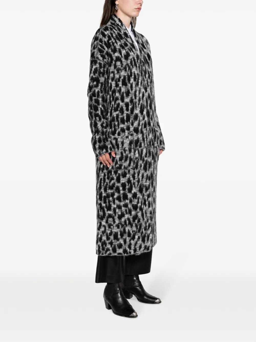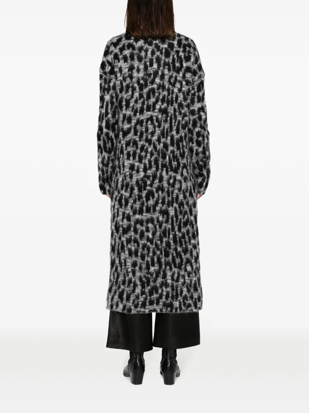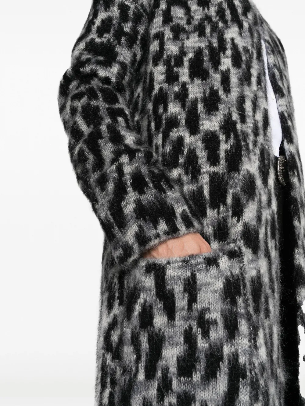 Черный/серый, смесовый мохер, матовый эффект, леопардовый принт, модель без застежки, длинные рукава, два накладных кармана спереди, длина до середины икры и прямой подол.