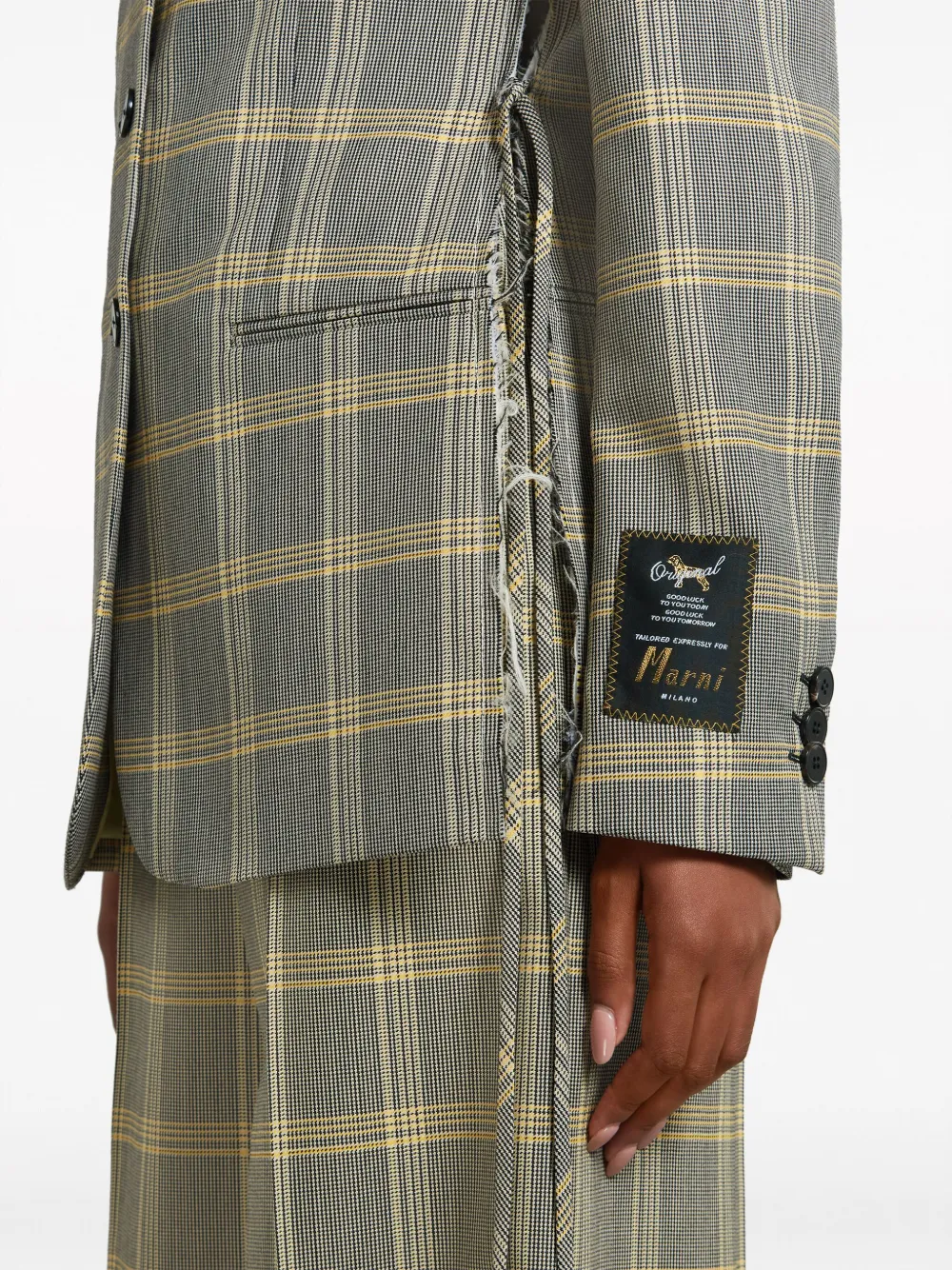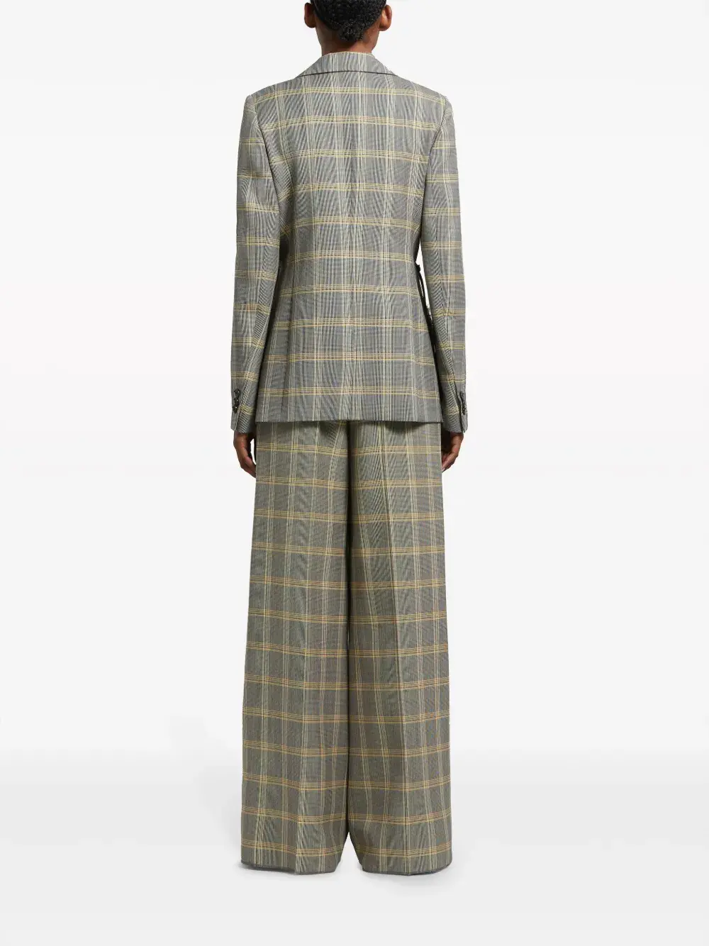 Серый, лимонный, черный, смесовая необработанная шерсть, клетчатый узор, модель с прорезями, нашивка с логотипом на рукаве, заостренные лацканы, застежка на пуговицах спереди, застежка с боковой кулиской, длинные рукава, манжеты на пуговицах, прорезной карман на груди, два прорезных кармана спереди, две боковые шлицы сзади и прямой подол.