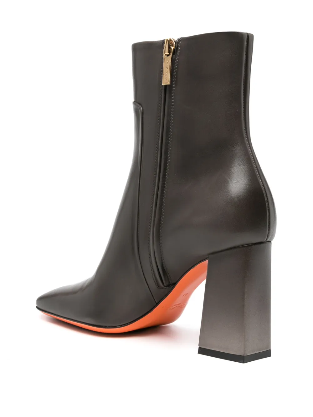Серый, телячья кожа, глянцевое покрытие, квадратный носок, застежка на молнии сбоку и высокий блочный каблук.