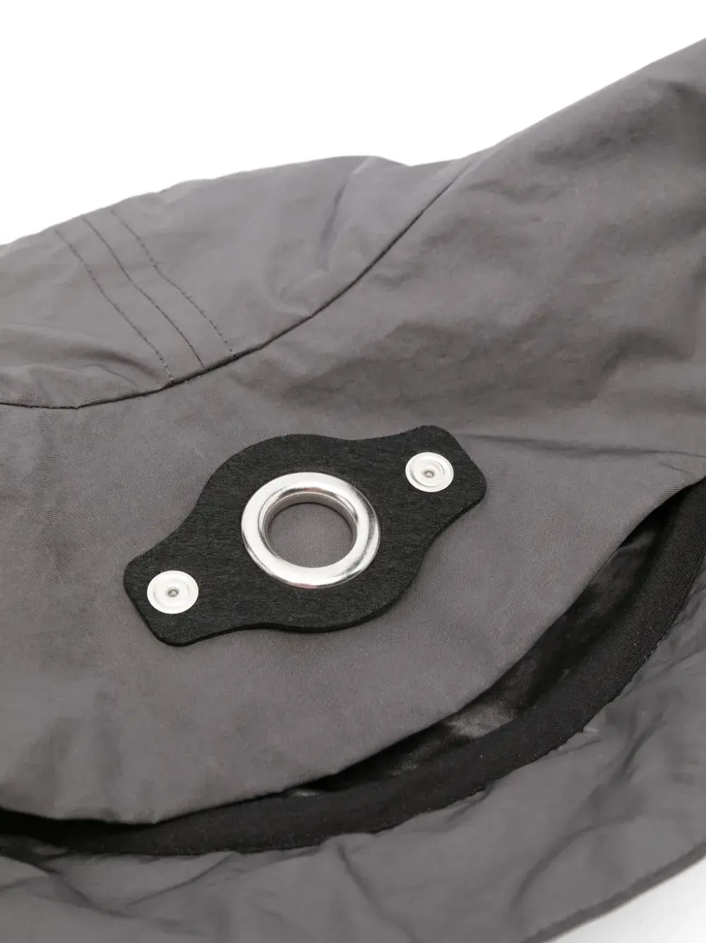 Серый, искусственная кожа, строчка в тон, отделка металлическими люверсами, плоская тулья, узкие закругленные поля, модель без застежки и модель без подкладки.