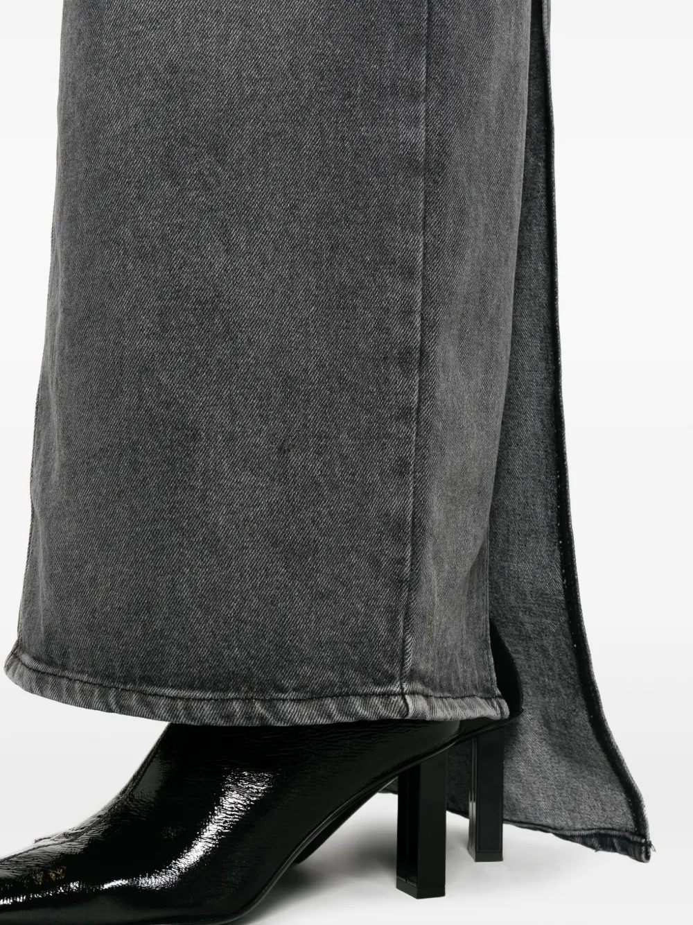 Серый, хлопок, деним, эффект потертости, нашивка с логотипом сзади, вырезные детали, застежка на молнии и пуговице спереди, широкая модель, пять карманов, два передних кармана с листочкой, прямой подол и длинная модель.
