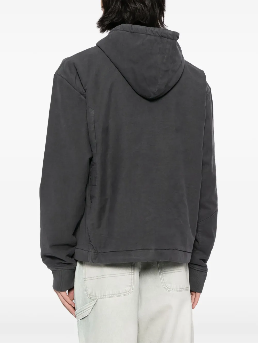Антрацитово-серый, металлический логотип, затягивающийся на шнурок капюшон, длинные рукава, манжеты в рубчик, карман-муфта и прямой подол.