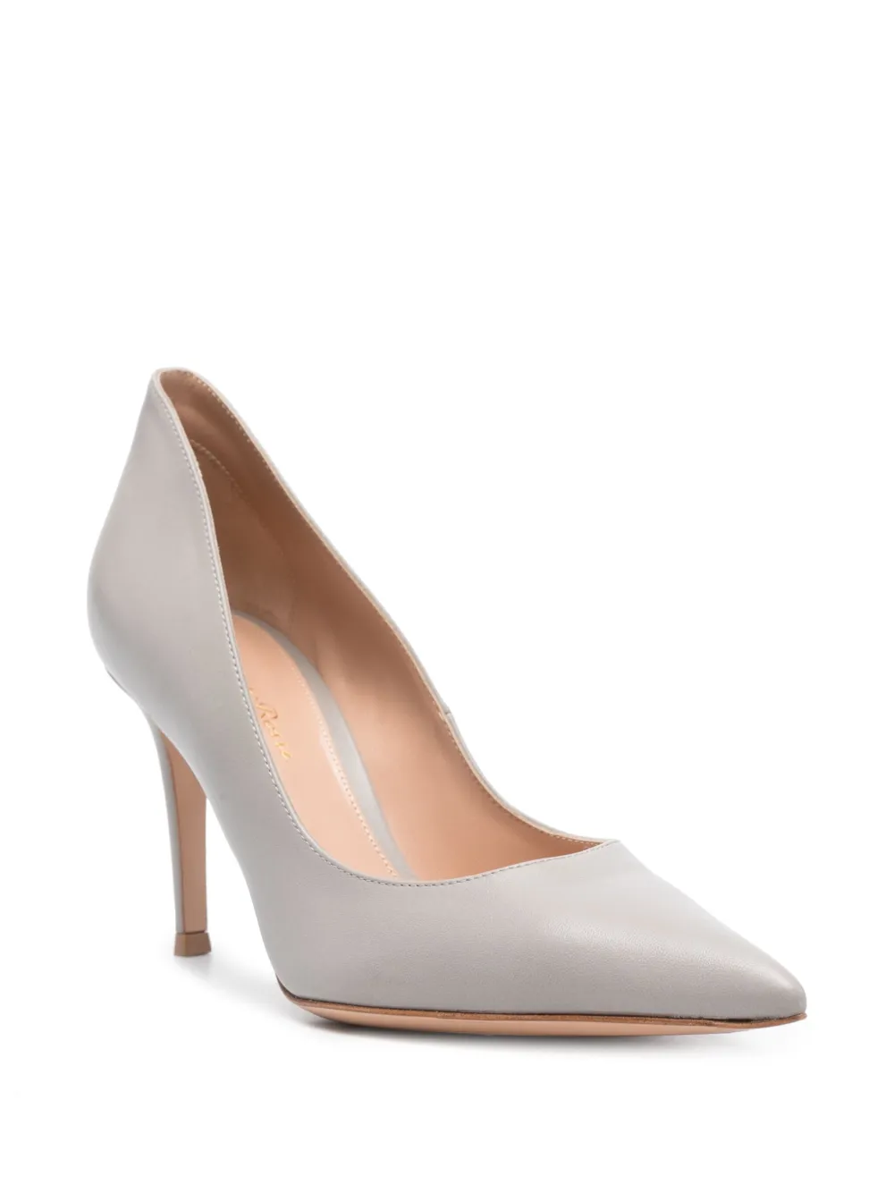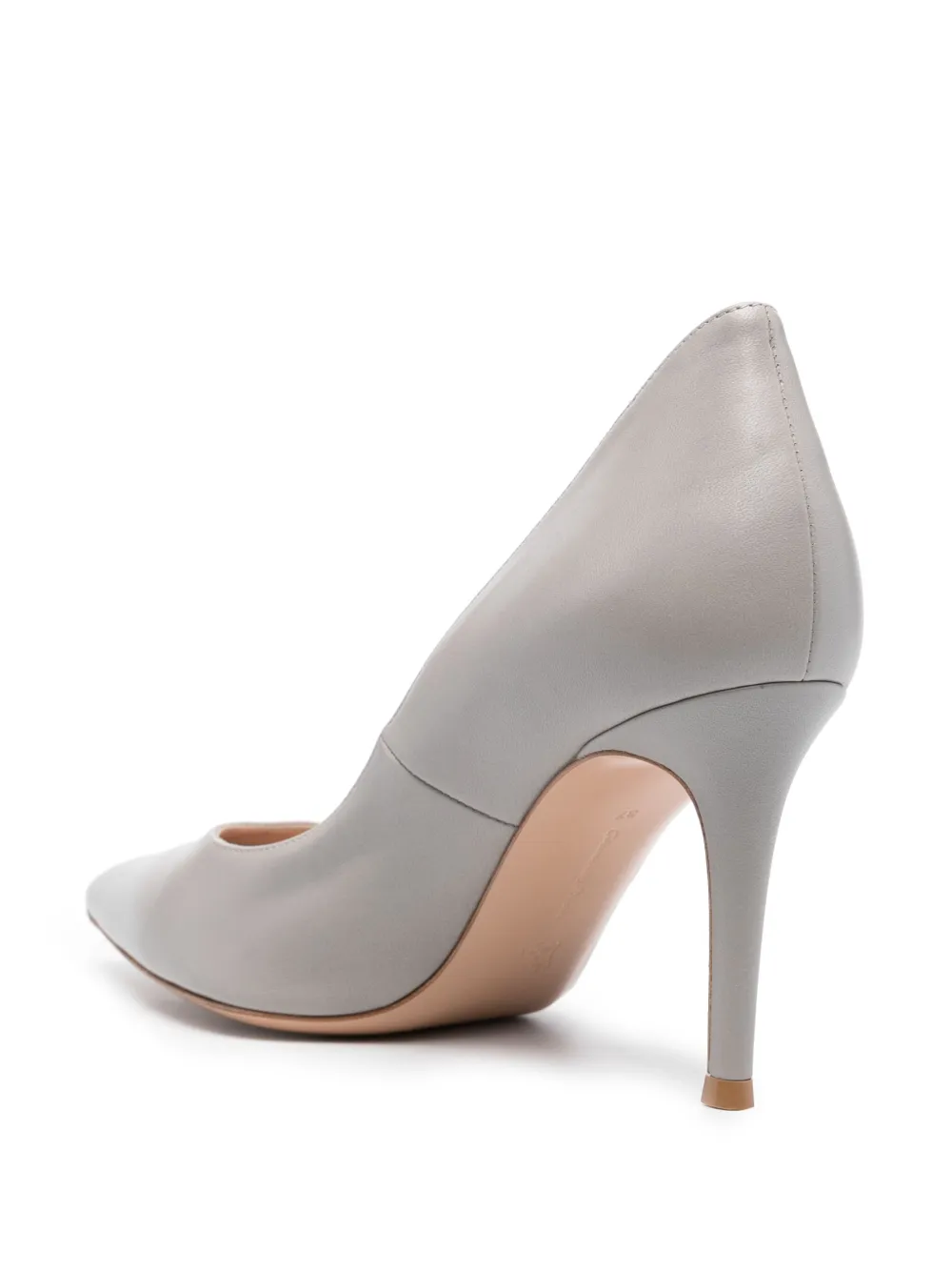 Светло-серый, телячья кожа, гладкая текстура кожи, строчка в тон, заостренный носок, модель без застежки, кожаная стелька с логотипом, каблук на высокой шпильке и кожаная подошва.