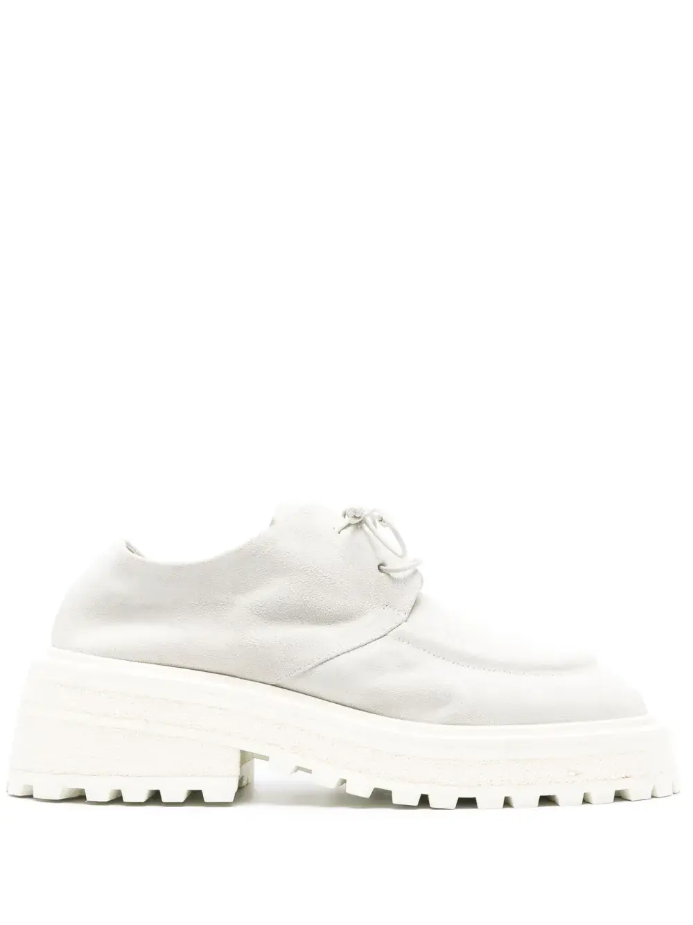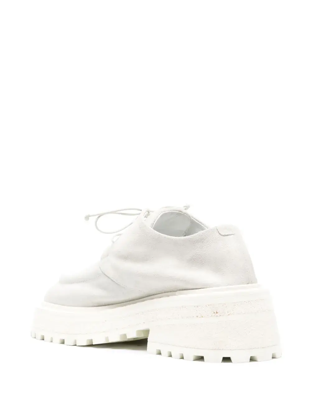Светло-серый, замша из телячьей кожи, полукруговой шов на носке, шнуровка спереди, блочный каблук и рифленая резиновая подошва.