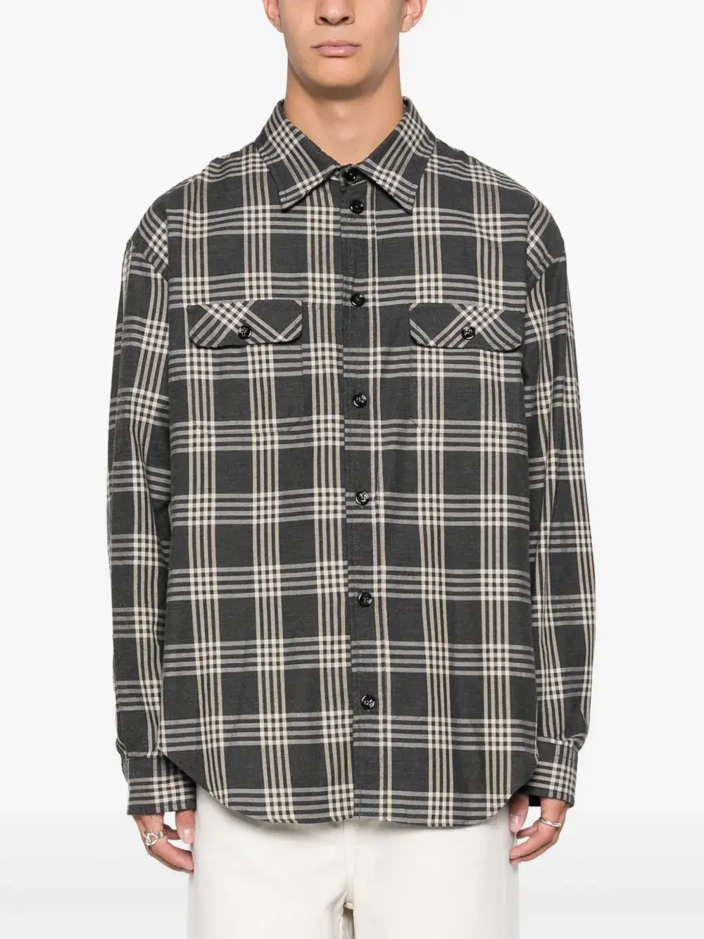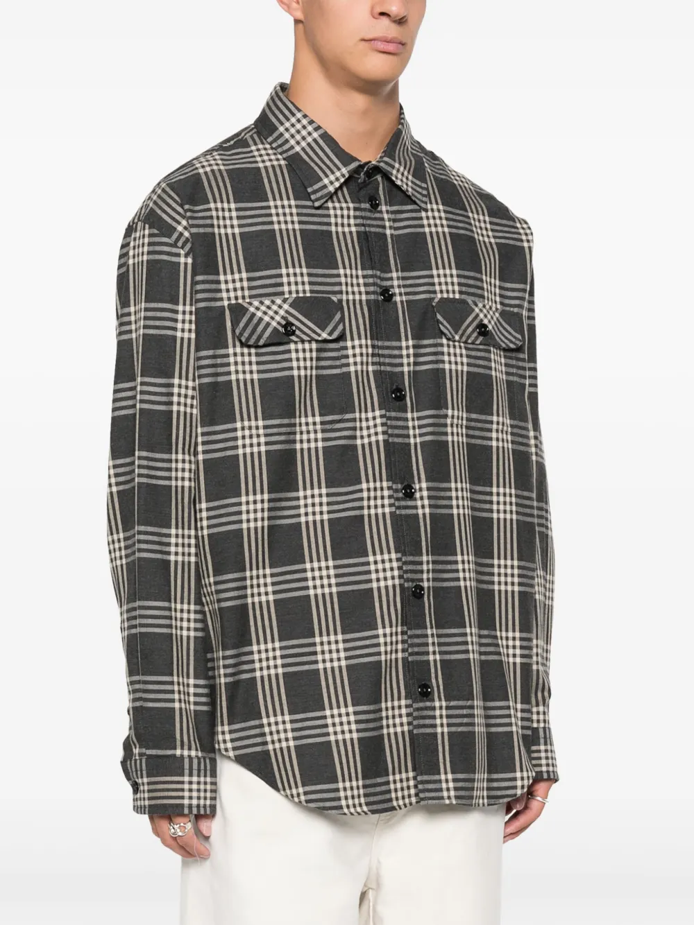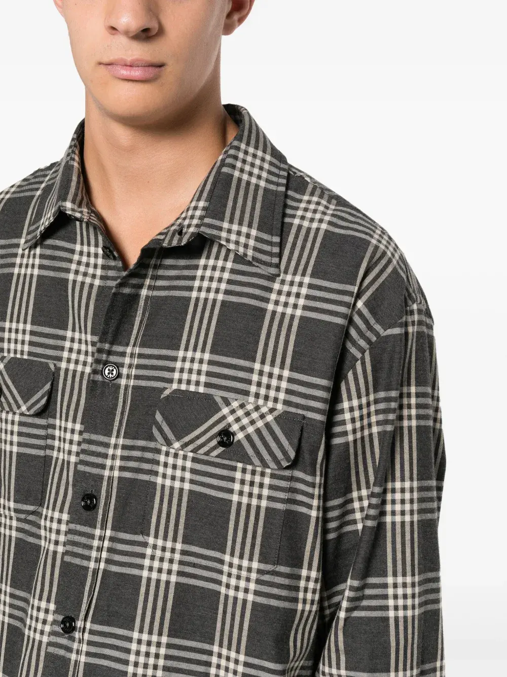 Серый, хлопок, фланель, принт с логотипом сзади, клетчатый узор, застежка на пуговицах спереди, классический воротник, длинные рукава, манжеты на пуговицах, боковые разрезы, два нагрудных кармана с клапанами и закругленный подол.