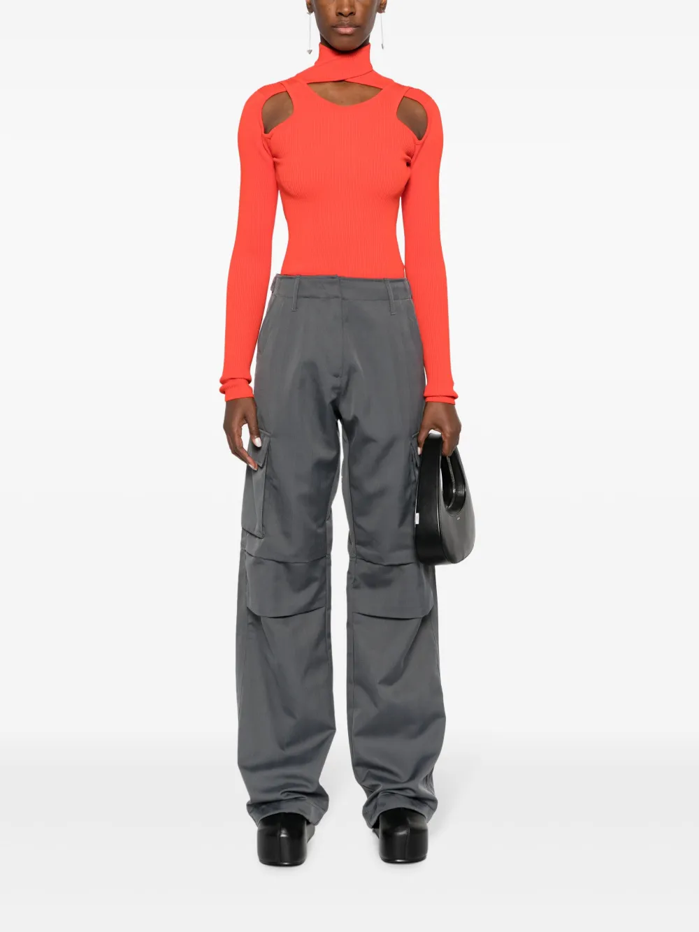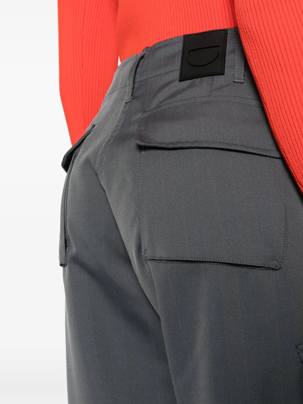 Черный/серый, хлопок, нашивка с логотипом сзади, завышенная талия, потайная застежка спереди, два кармана по бокам, два накладных кармана по бокам, карман с клапаном сзади, петли для ремня и широкий крой.