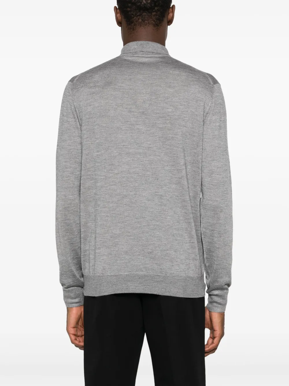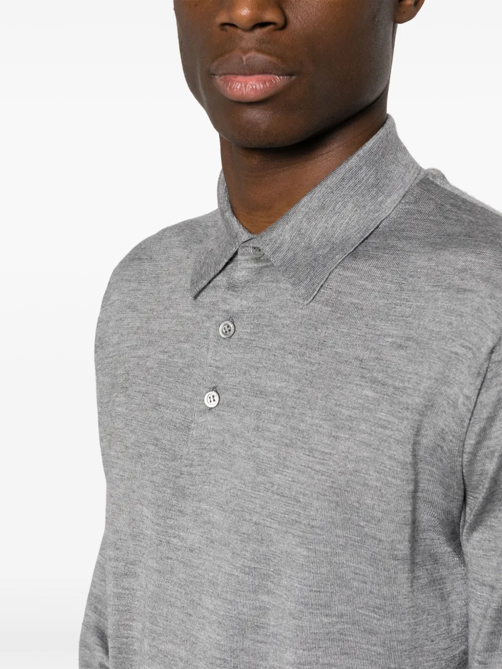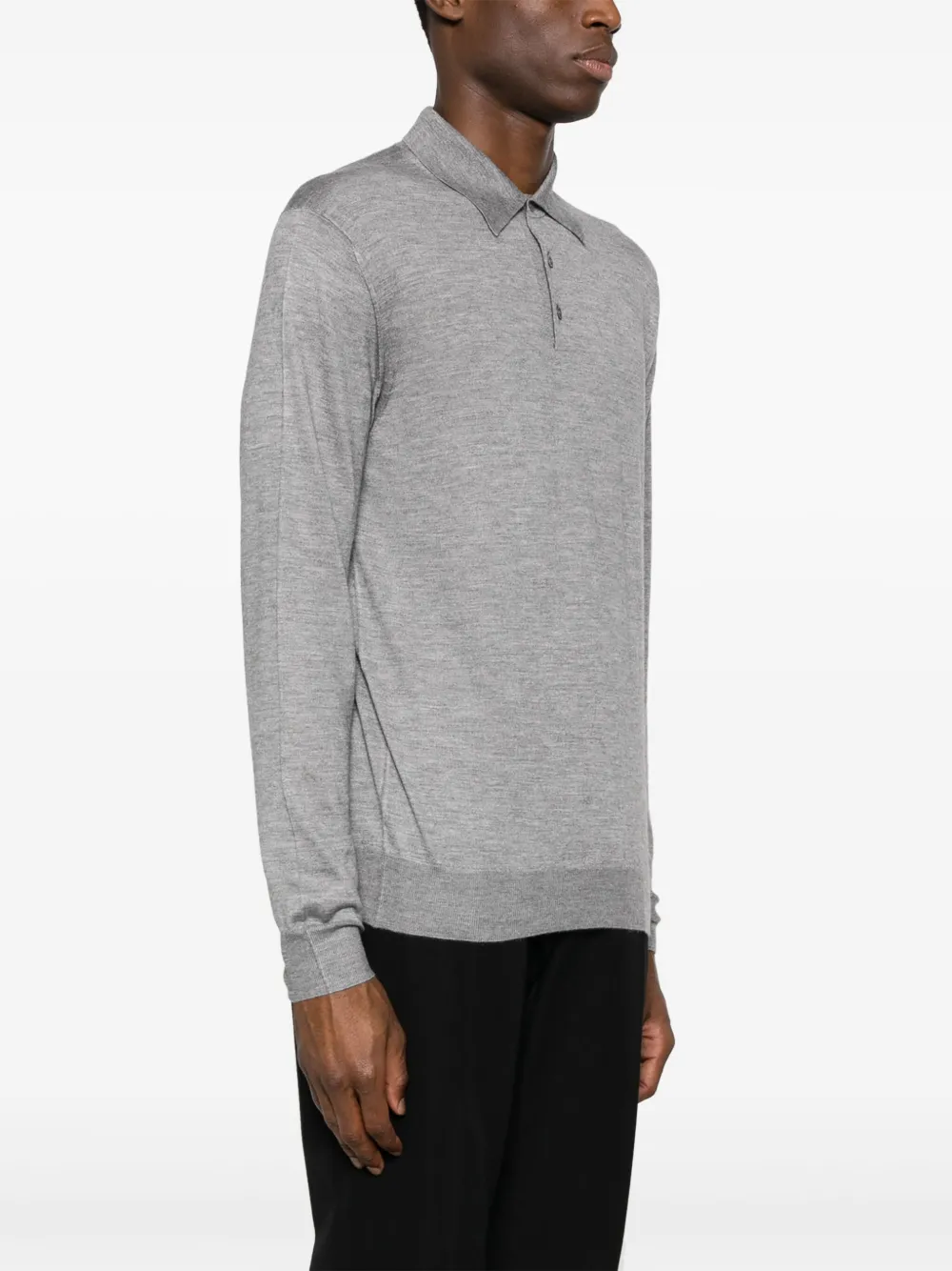 Смесь кашемира и шелка, тонкая вязка, воротник поло, планка на пуговицах спереди и длинные рукава.