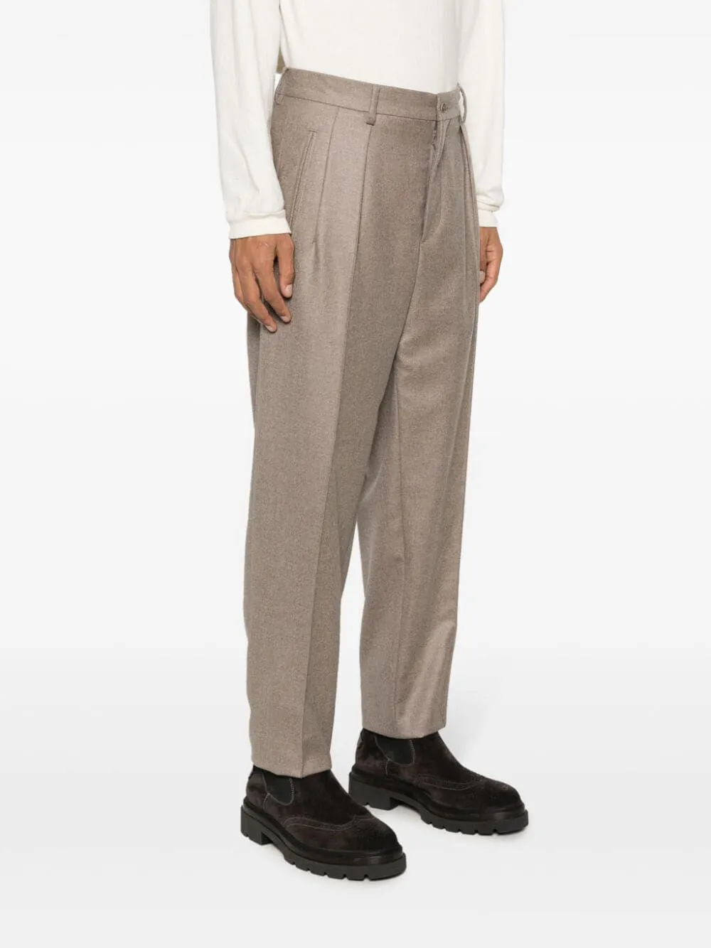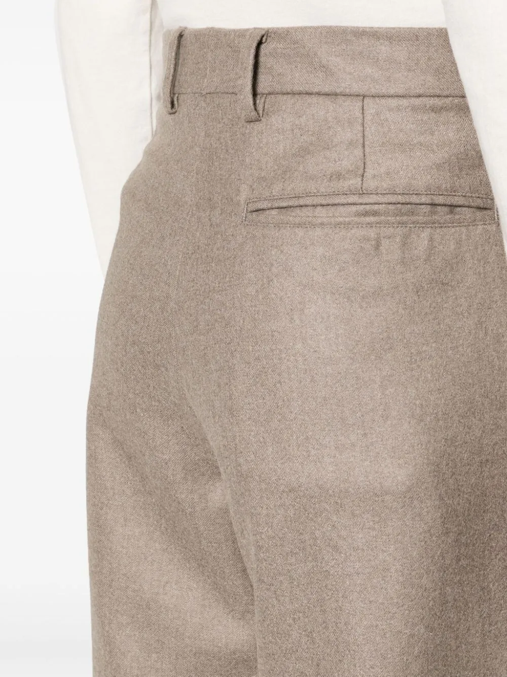 Коричневый, кашемир, завышенная талия, кулиска на талии, стрелки, два прорезных кармана по бокам, два прорезных кармана сзади, узкий крой и зауженный крой.