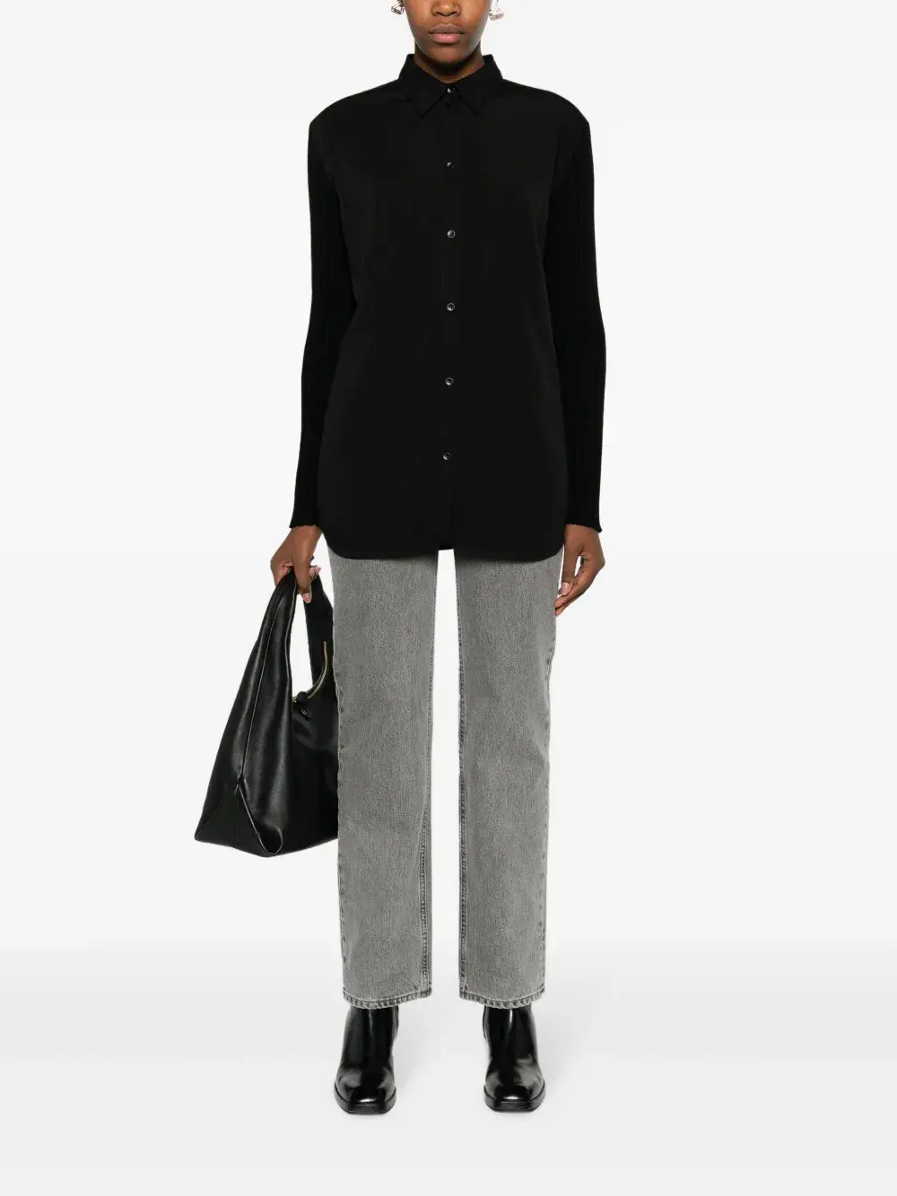 Серый, хлопок, обработанный деним, нашивка с логотипом сзади, серебристая фурнитура с выгравированным логотипом, прямой крой, средняя посадка, потайная пуговичная застежка спереди, петли для ремня и пять карманов.