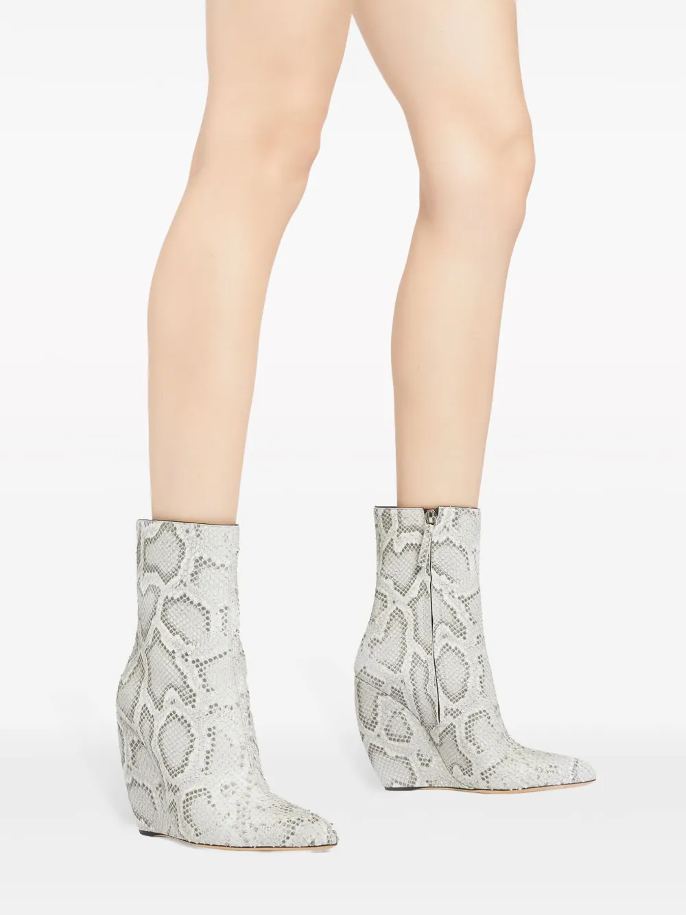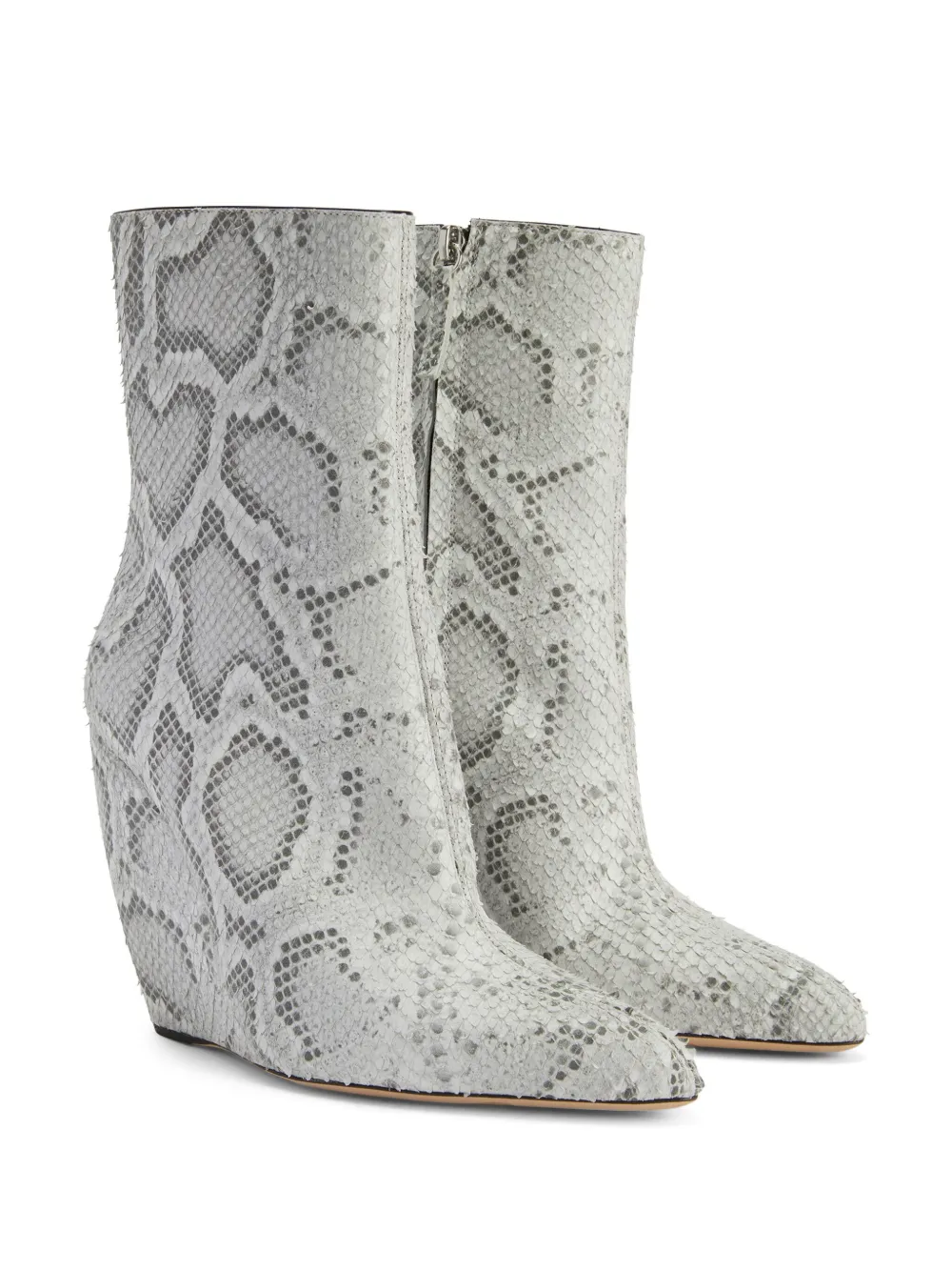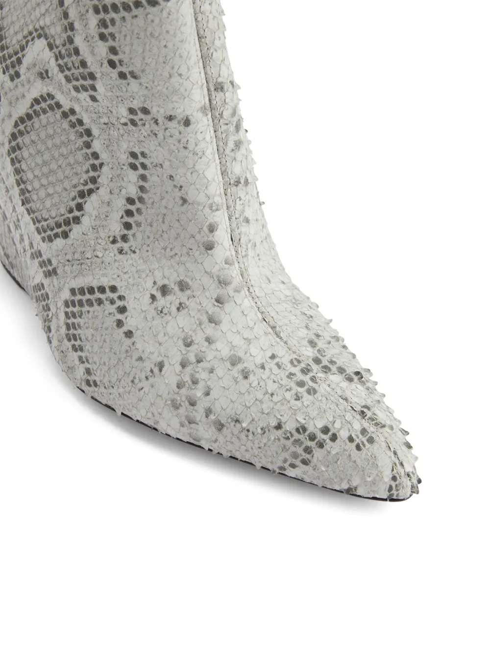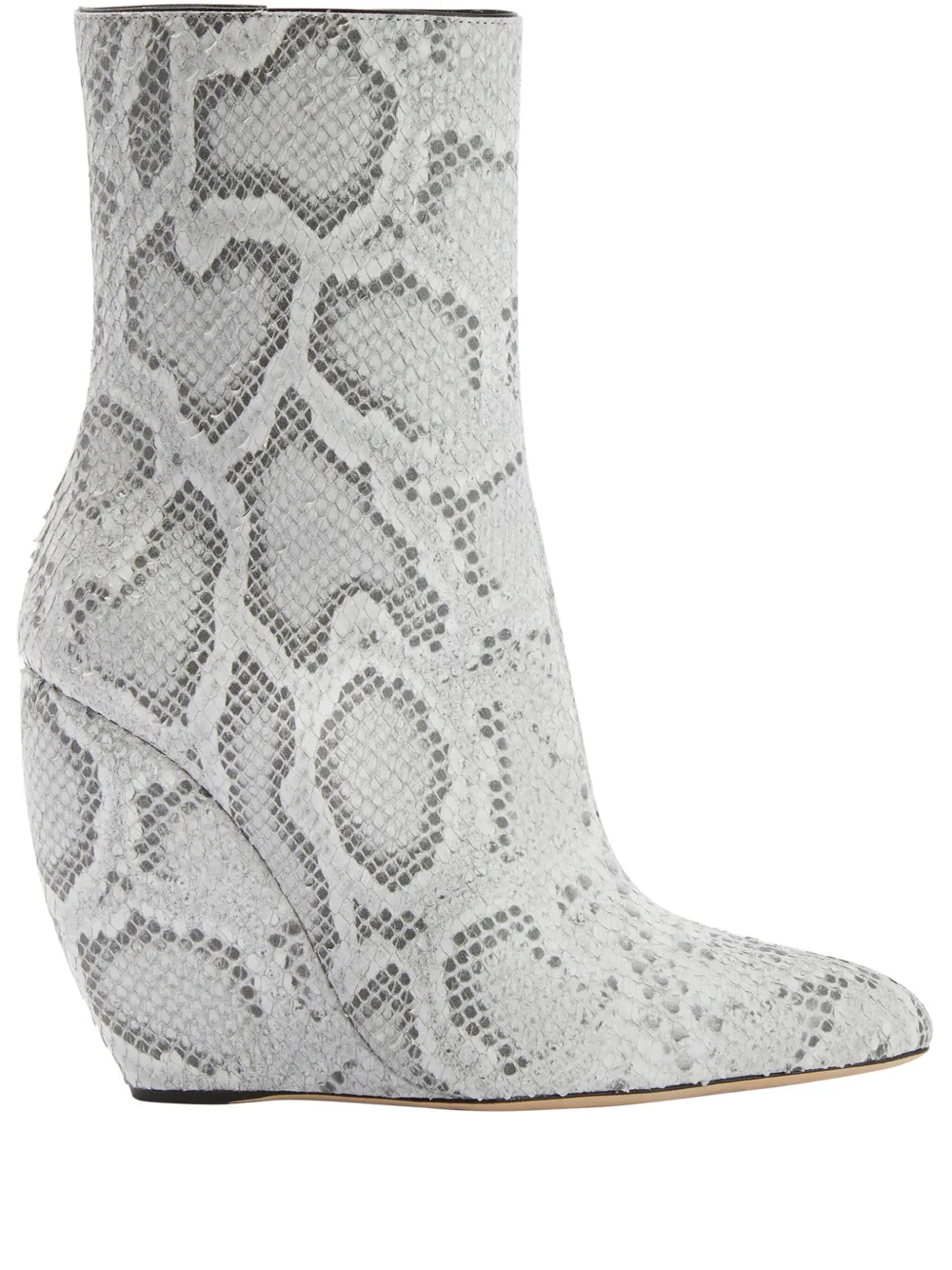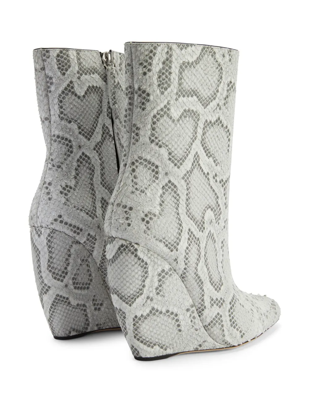 Серый, телячья кожа, сплошной принт под змеиную кожу, заостренный носок, застежка на молнии сбоку, высота по щиколотку, кожаная подошва и высокая танкетка.