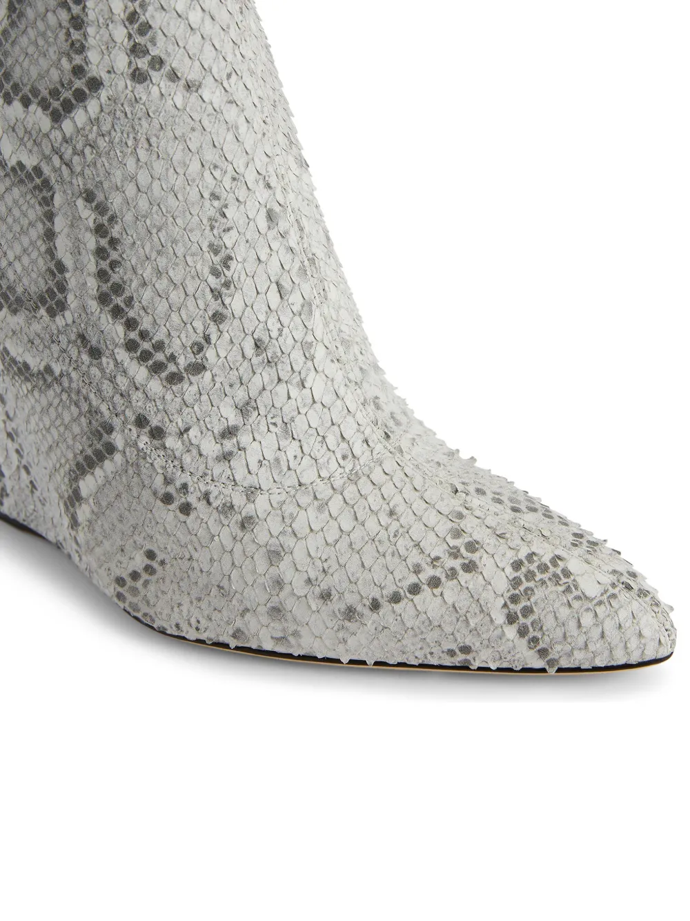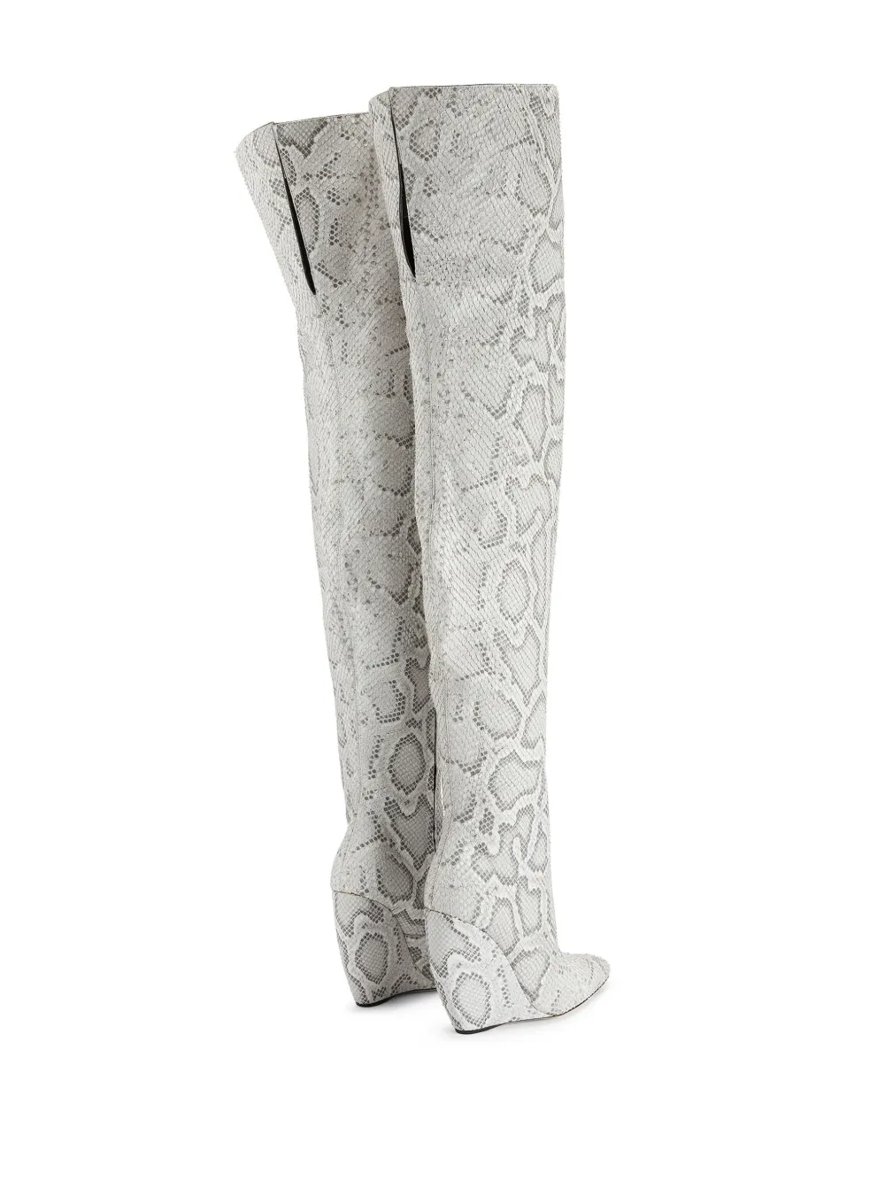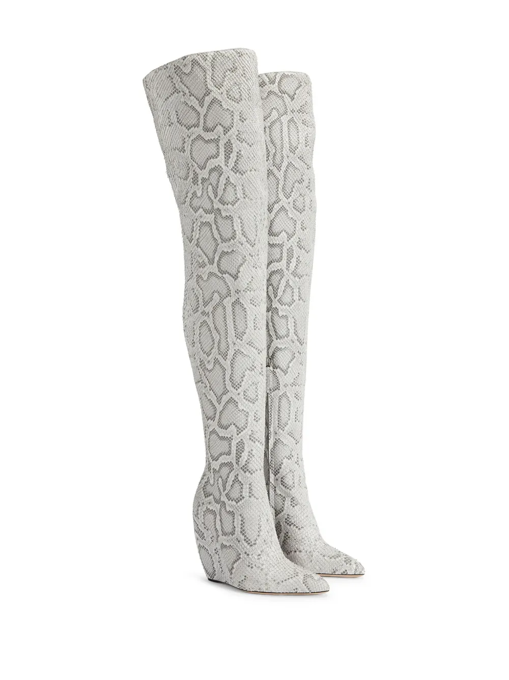 Серый, телячья кожа, сплошной принт под змеиную кожу, заостренный носок, застежка на молнии сзади, высота по колено, кожаная подошва и высокая танкетка.