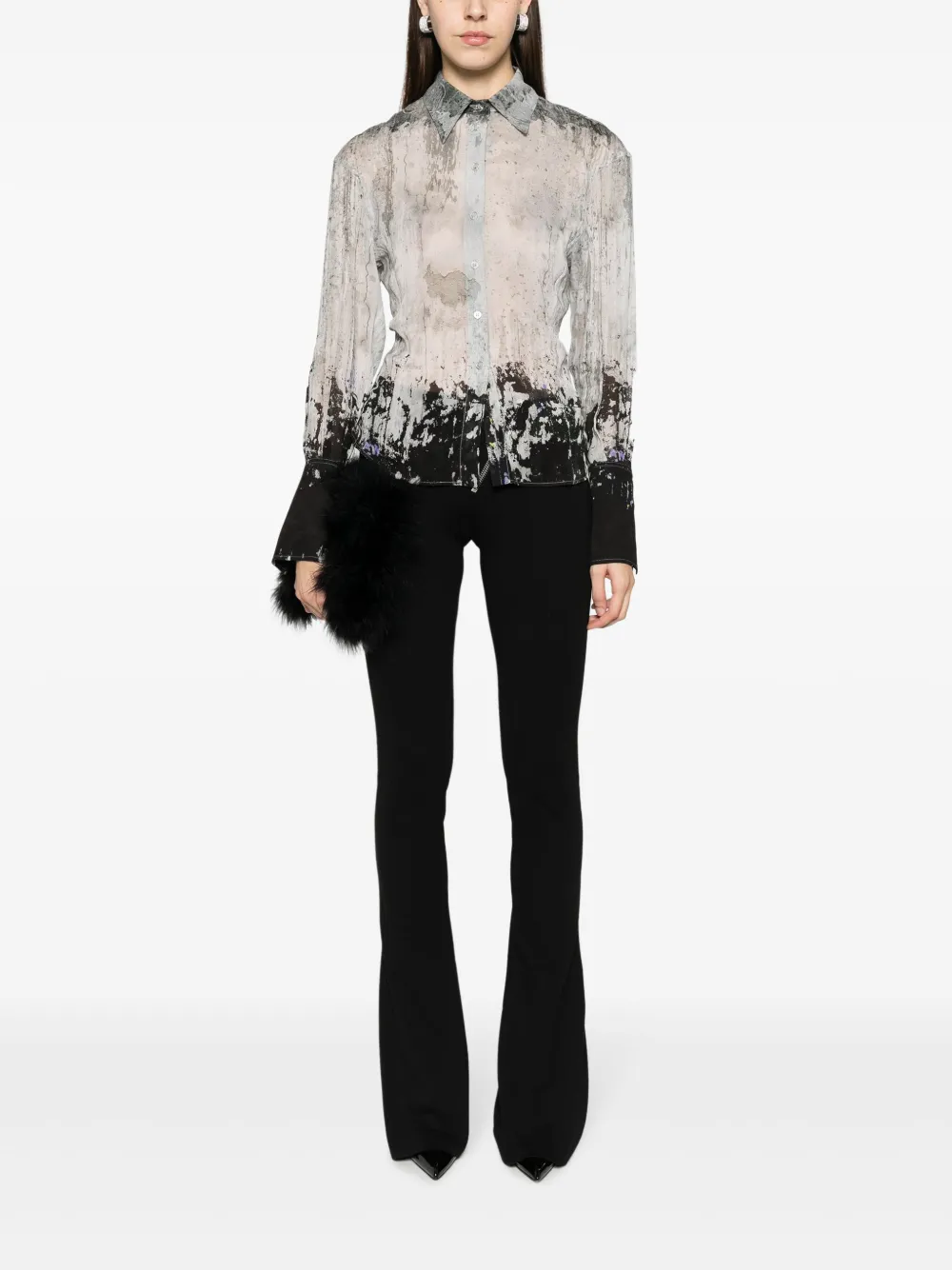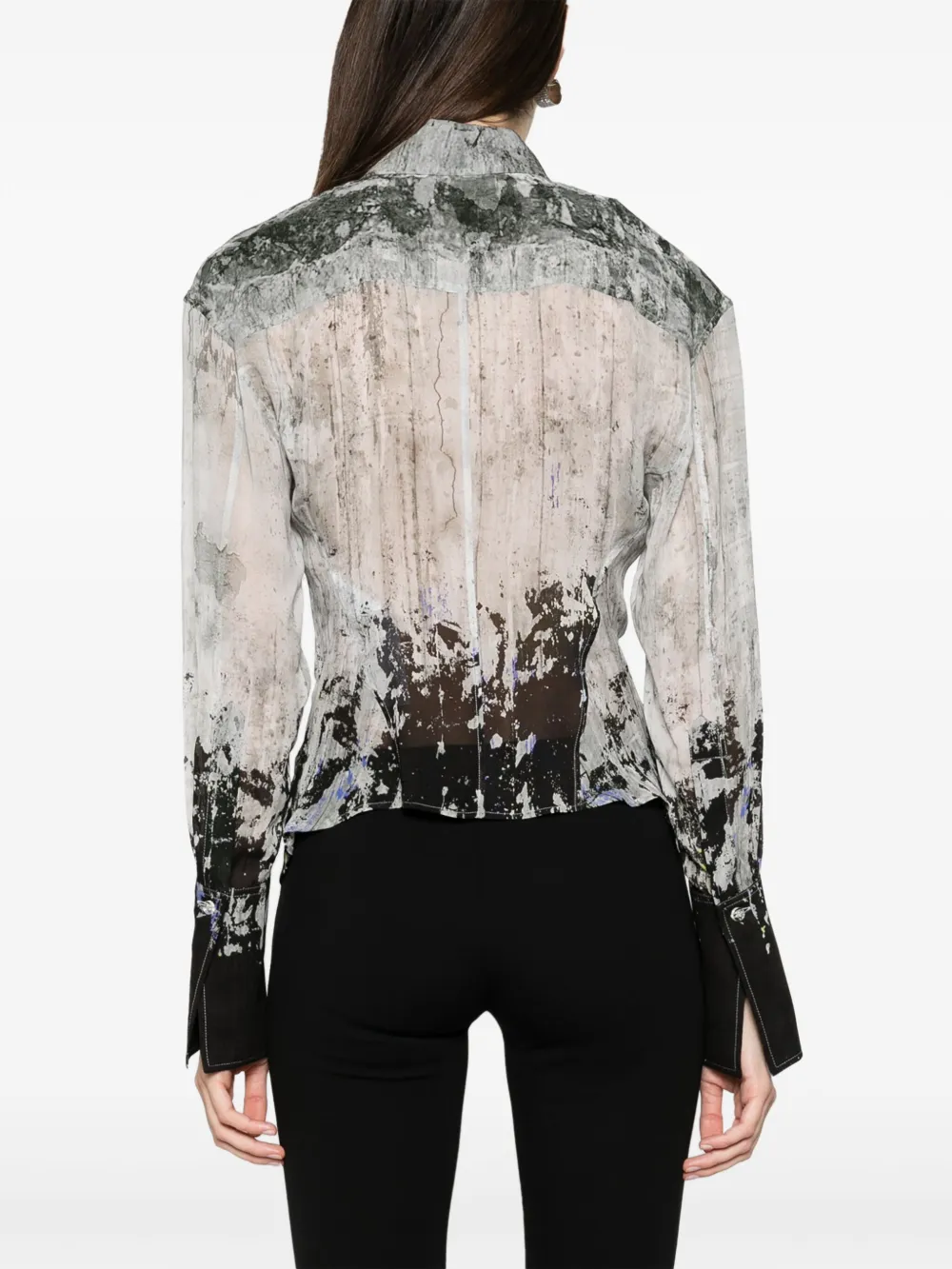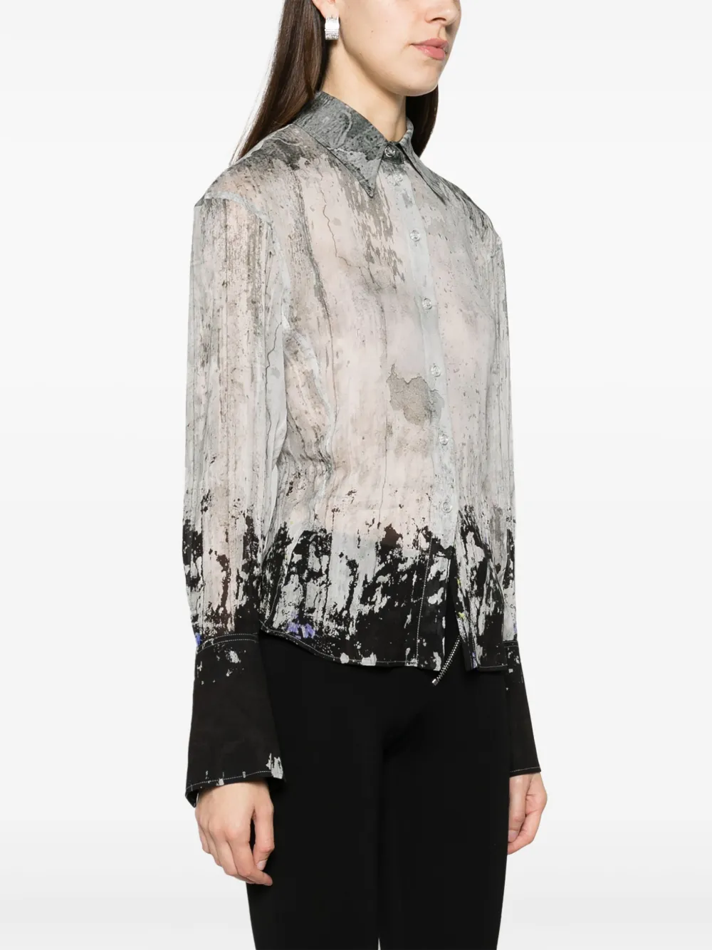 Светло-серый, разноцветный, полупрозрачный дизайн, без эффекта утяжеления, абстрактный принт, прямой воротник, застежка на пуговицах спереди, длинные рукава, манжеты на пуговицах и закругленный подол.