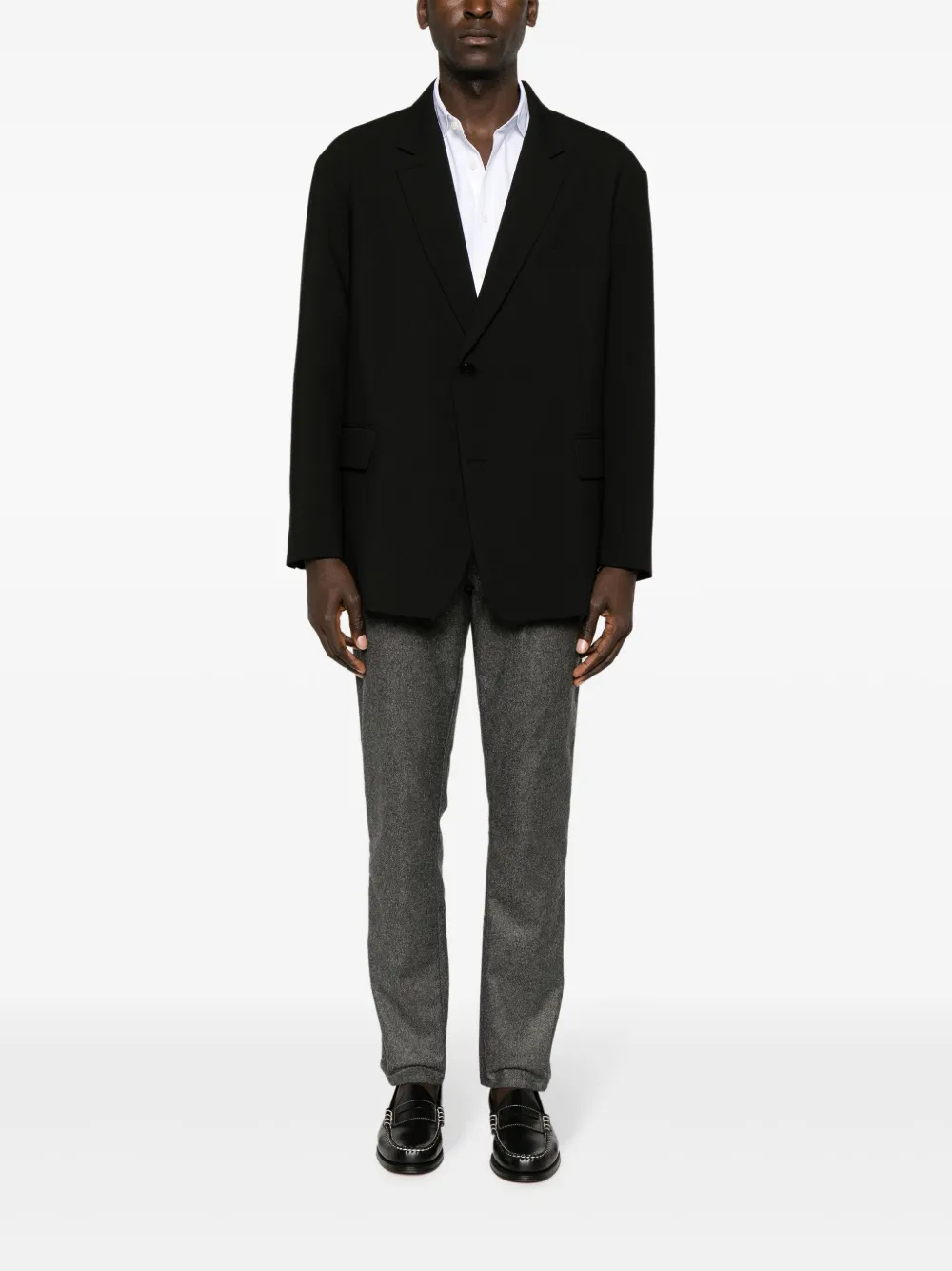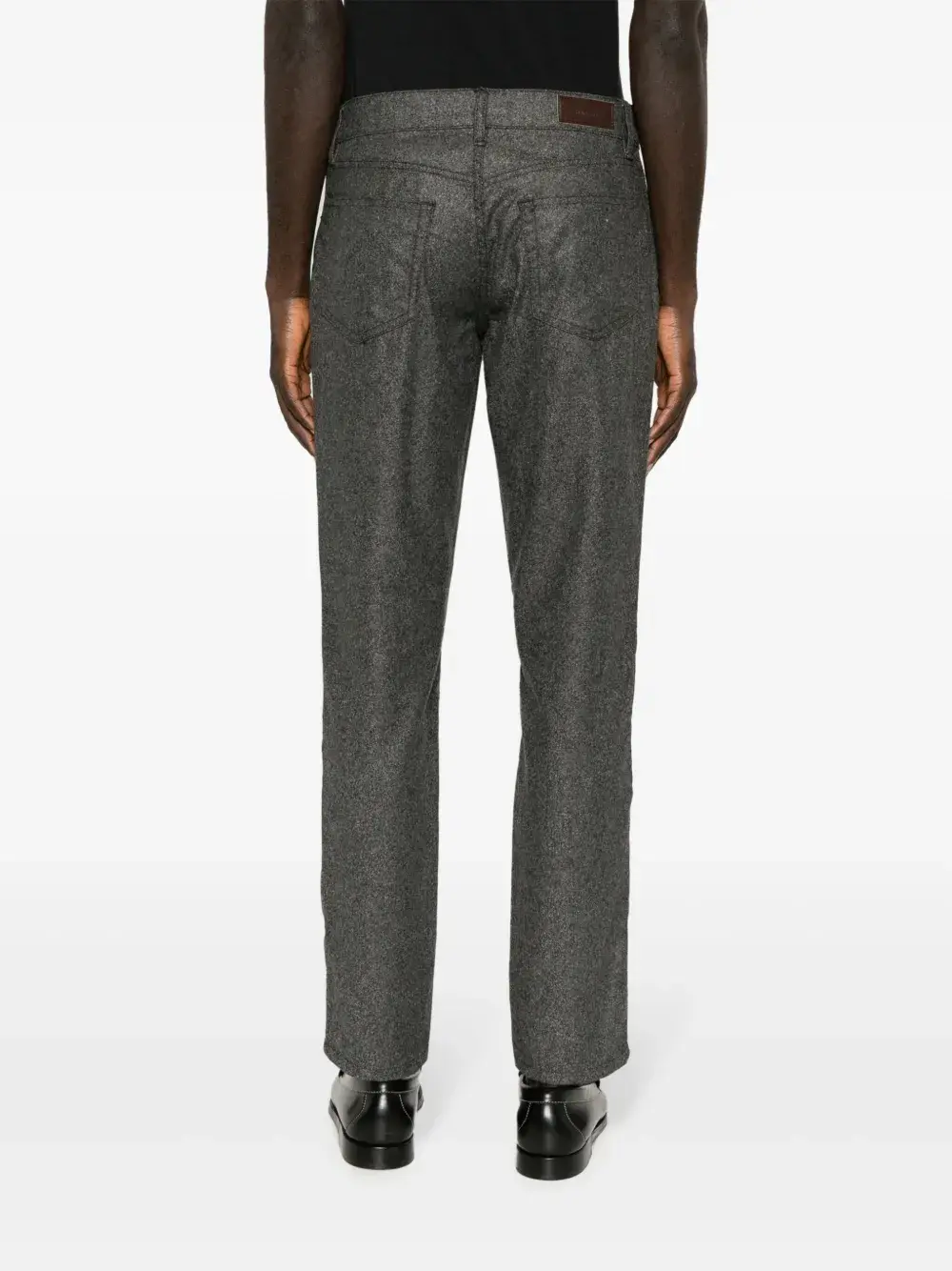 Пепельно-серый, смесь шерсти и кашемира, фланель, нашивка с логотипом сзади, петли для ремня, застежка на молнии и пуговице спереди, прямой крой и пять карманов.